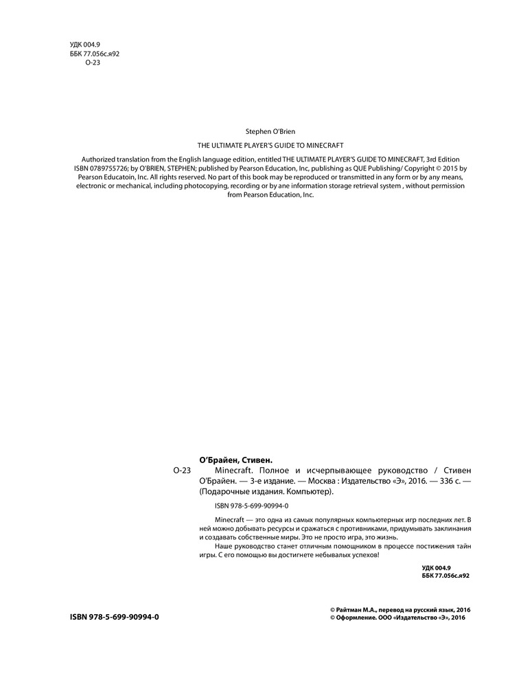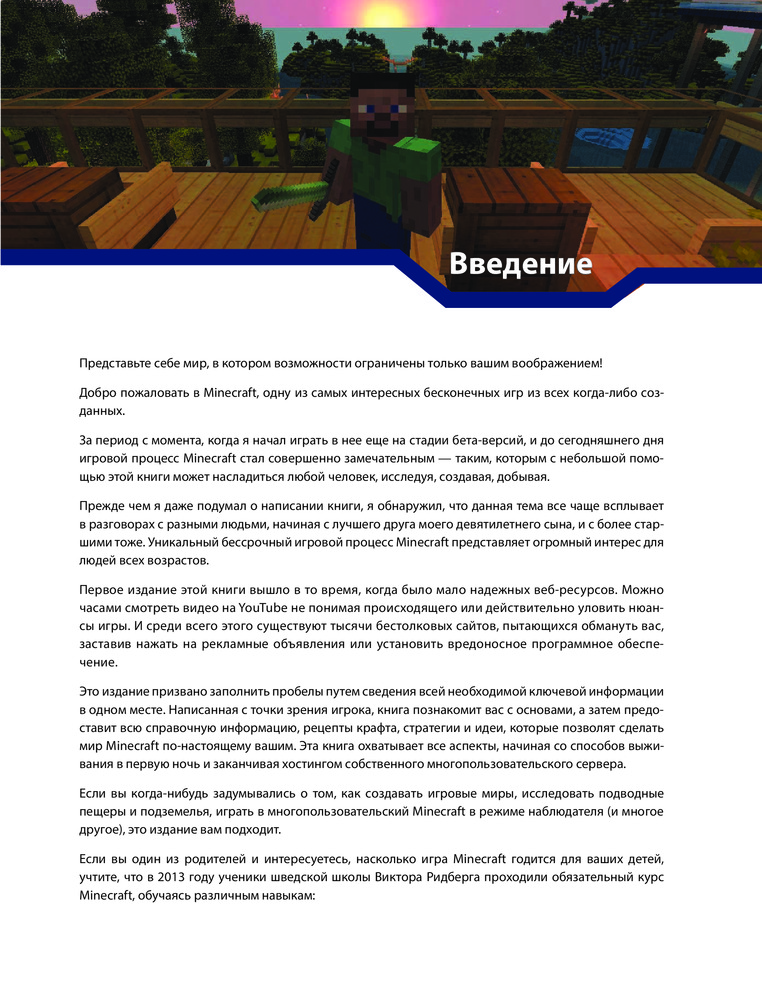 Minecraft. Полное и исчерпывающее руководствоВ данный момент этот товар отсутствует в продаже. Возможно, у нас найдется аналогичный или похожий товар здесь. Серия: Подарочные издания. Компьютер Minecraft — это одна из самых популярных компьютерных игр последних лет. В ней можно добывать ресурсы и сражаться с противниками, придумывать заклинания и создавать собственные миры. Это не просто игра, это жизнь. |