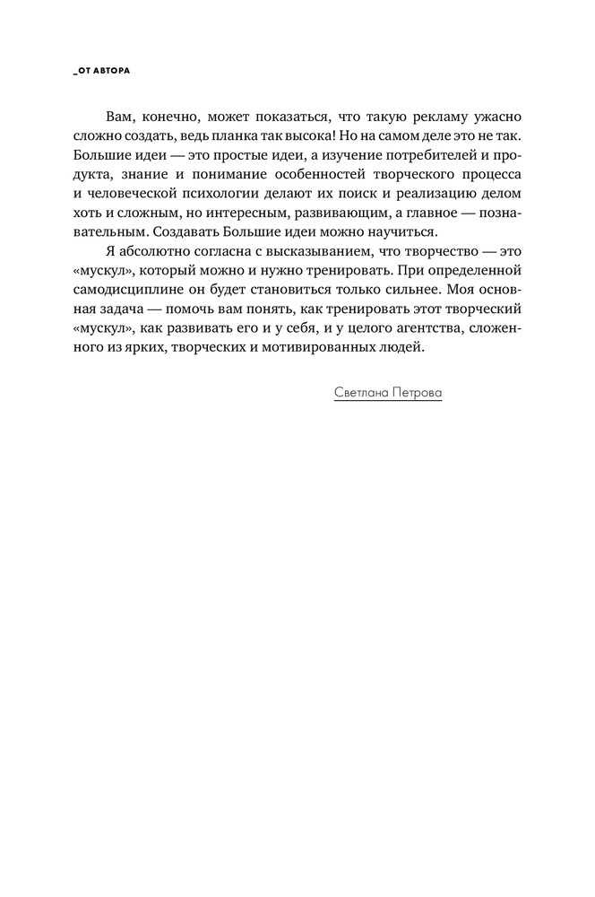 Светлана Петрова, известный специалист в области рекламы и брендинга, более 10 лет руководившая ведущими агентствами России, многократно награждаемыми на престижнейших фестивалях мира, в своей книге рассказывает о том, что есть реклама, которая восхищает, и что делать ее нелегко, но как минимум интересно и полезно.