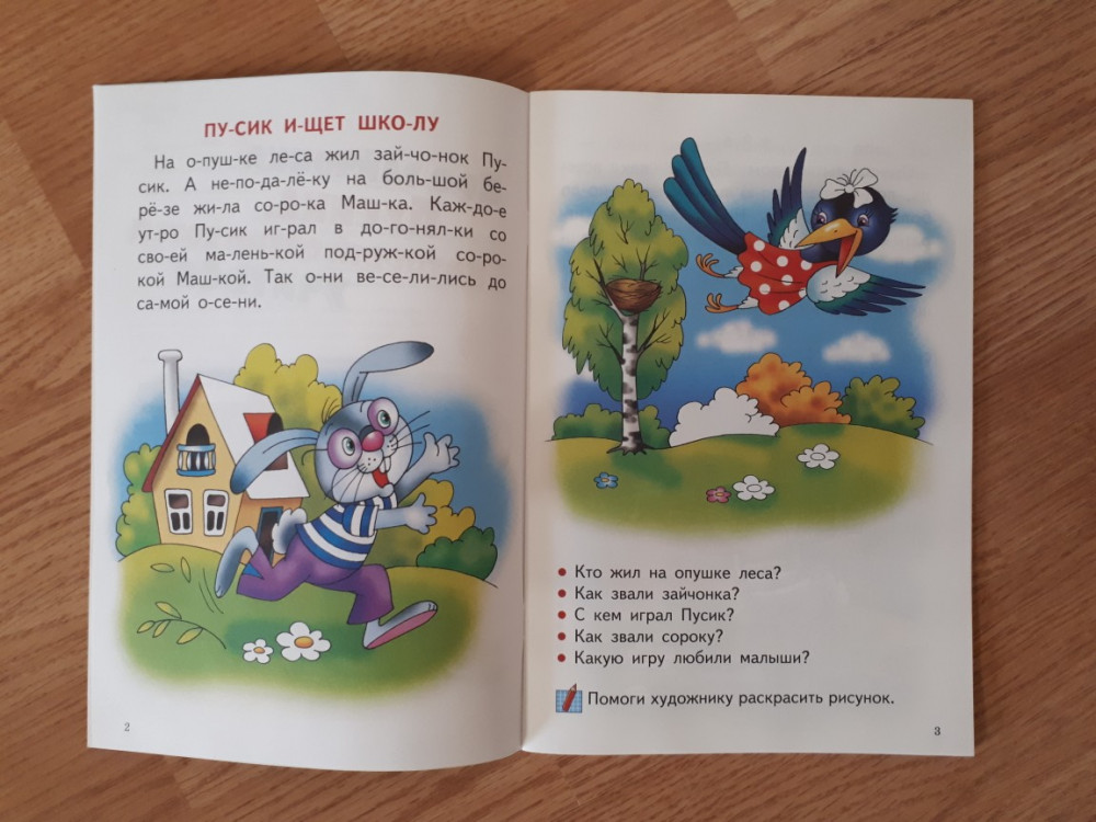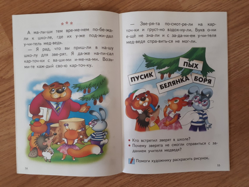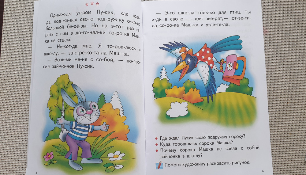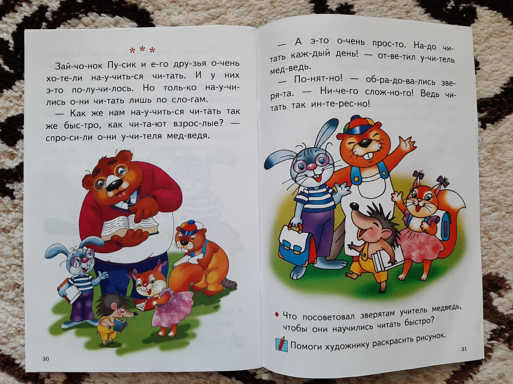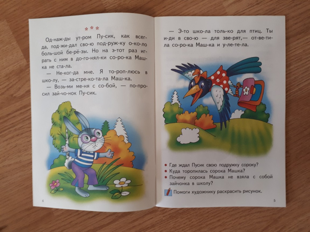Книгой осталась довольна! Обложка тонкая, листы белые, шрифт крупный, слова поделены на слоги. История очень простая. О том как зайчонок идет в школу. История поделена на части. В конце каждой части есть вопросы. Картинки очень красивые и яркие. Некоторые части ребенок должен раскрасить сам. Есть несколько небольших заданий. Хороший вариант для первого чтения после букваря.