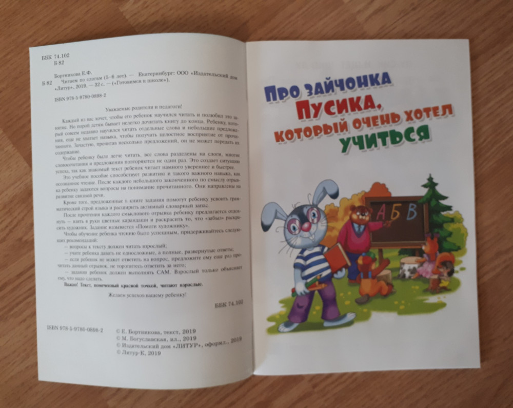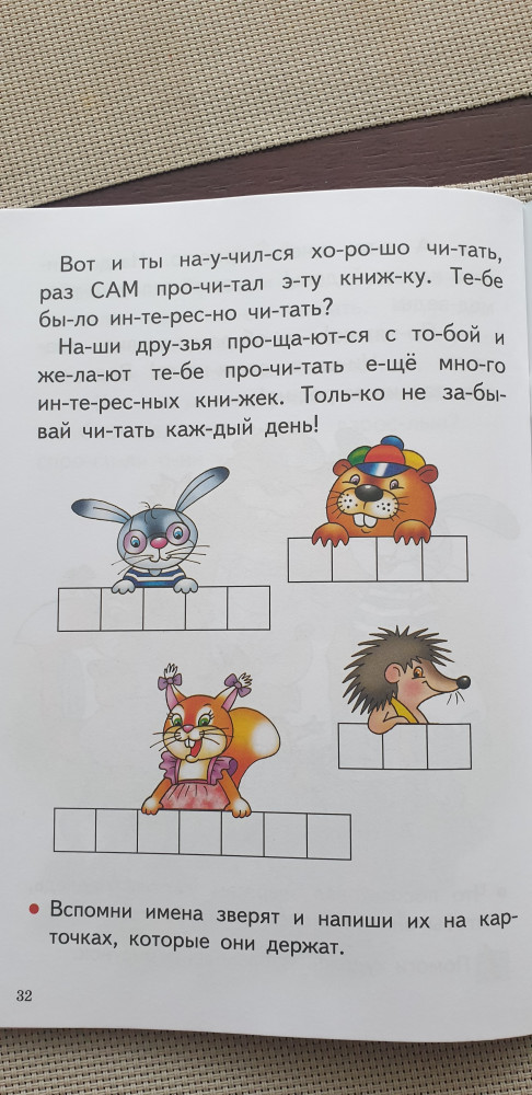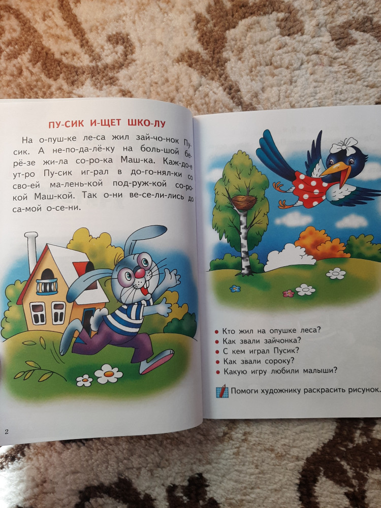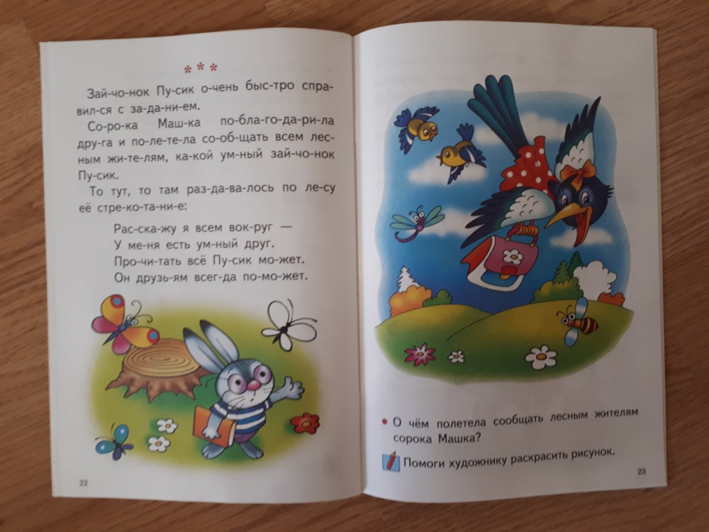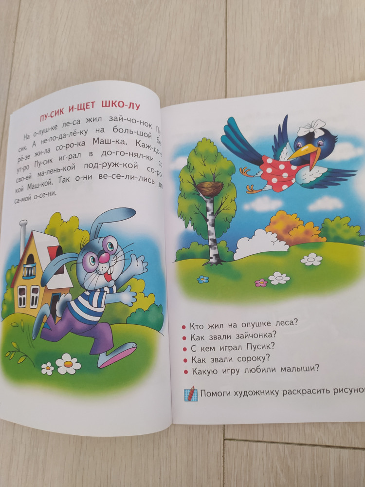 Книгой осталась довольна! Обложка тонкая, листы белые, шрифт крупный, слова поделены на слоги. История очень простая. О том как зайчонок идет в школу. История поделена на части. В конце каждой части есть вопросы. Картинки очень красивые и яркие. Некоторые части ребенок должен раскрасить сам. Есть несколько небольших заданий. Хороший вариант для первого чтения после букваря.