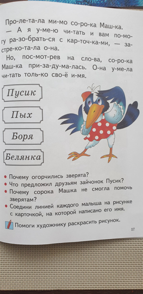 Ребенку книжка понравилась, можно читать по небольшой главе, есть небольшие задания. Помоги раскрасить, составить словосочетания, написать имена героев и т.д.