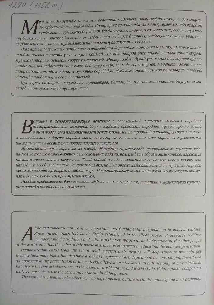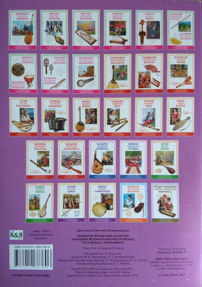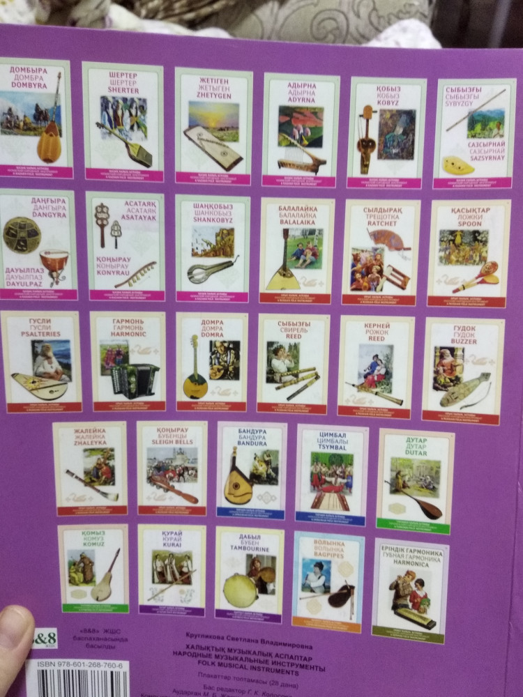 Дидактические карточки. Народные музыкальные инструменты (28 карточек) А-4В данный момент этот товар отсутствует в продаже. Возможно, у нас найдется аналогичный или похожий товар здесь. «Халықтық музыкалық аспаптар» жинағындағы көрсетілім карточкалары оқушыларға аспаптардың басты түрлерін ұсынып қана қоймай, сол аспаптарда өнер туындыларын ойнап тұрған музыканттардың бейнесін көруге көмектеседі. Материалдың бұлай ұсынылуы осы көрнекі құралдарды музыка сабағында ғана емес, бейнелеу өнері, әлемдік көркемсурет мәдениеті және дүниетану сабақтарында қолдануға мүмкіндік береді. Көптілді компонент осы карточкаларды тілдерді үйренуде пайдалануға септігін тигізеді. Бұл құрал оқытудың тиімділігін арттыруға, балаларды музыка мәдениетіне баулуға және олардың ой-өрісін кеңейтуге арналған. |