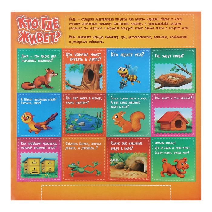 Пазл раздвижной «Кто где живет»В данный момент этот товар отсутствует в продаже. Возможно, у нас найдется аналогичный или похожий товар здесь. Пазл раздвижной "Кто где живет" — это оригинальная головоломка, которая надолго увлечет непоседу! Малыш с удовольствием будет изучать красочные картинки и двигать элементы пазла. Эта уникальная игрушка станет полезным и приятным подарком для ребёнка, а также будет способствовать полноценному и гармоничному развитию его личности. |