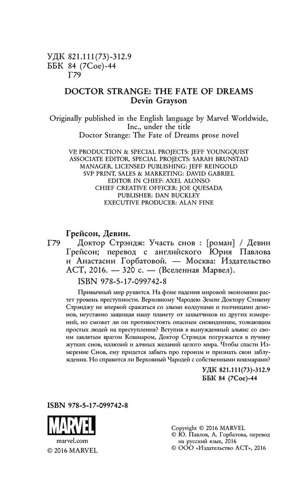 Доктор Стрэндж. Участь сновВ данный момент этот товар отсутствует в продаже. Возможно, у нас найдется аналогичный или похожий товар здесь. Серия: Вселенная Марвел Привычный мир рушится. На фоне падения мировой экономики растет уровень преступности. Верховному Магу Земли Доктору Стивену Стрэнджу не впервой сражаться со злыми колдунами и полчищами демонов, неустанно защищая нашу планету от захватчиков из других измерений, но сможет ли он противостоять опасным сновидениям, толкающим простых людей на преступления? Вступив в вынужденный альянс со своим заклятым врагом Кошмаром, Доктор Стрэндж погружается в пучину жутких снов, иллюзий и алчных желаний целого мира. Чтобы спасти Измерение Снов, ему придется забыть про героизм и признать свои заблуждения. Но справится ли Верховный Маг с собственными кошмарами? |
