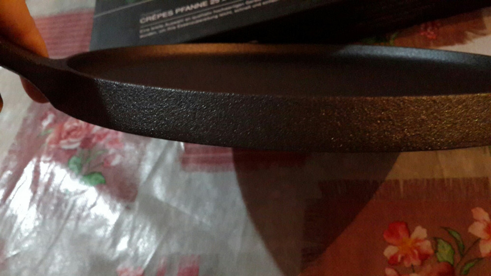 Замечательная сковорода для блинчиков. Качественная, тяжелая. Но я приспособилась и сковородку не поднимаю, а тесто распределяю деревянной лопаткой, которую взяла в комплект. Также взяла силиконовую насадку на ручку, нет проблем с прихватками. Очень довольна всеми покупками. Наконец я пеку большие, кружевные блинчики. Не сомневайтесь, сковородка хорошая!
