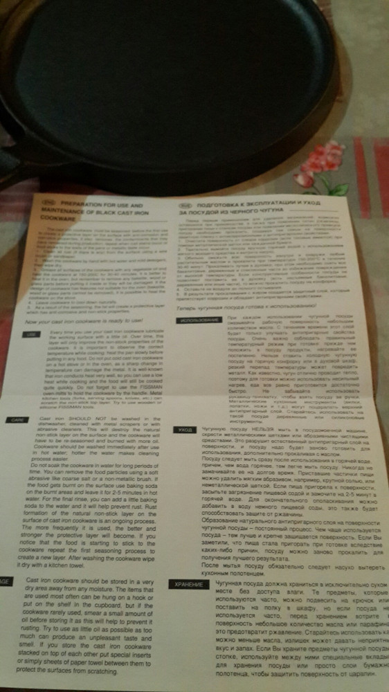 Ставлю четверку, потому что еда на ней все-таки подгорает. Придется теперь на этой жарить. Ручка действительно чугунная и нагревается здорово. Если вы печете блины переворачивая руками, то такая ручка мешать не будет. А вот подбрасывать с ней абсолютно невозможно. Сковороду обязательно прокалить перед использованием, так как на ней много химикатов.