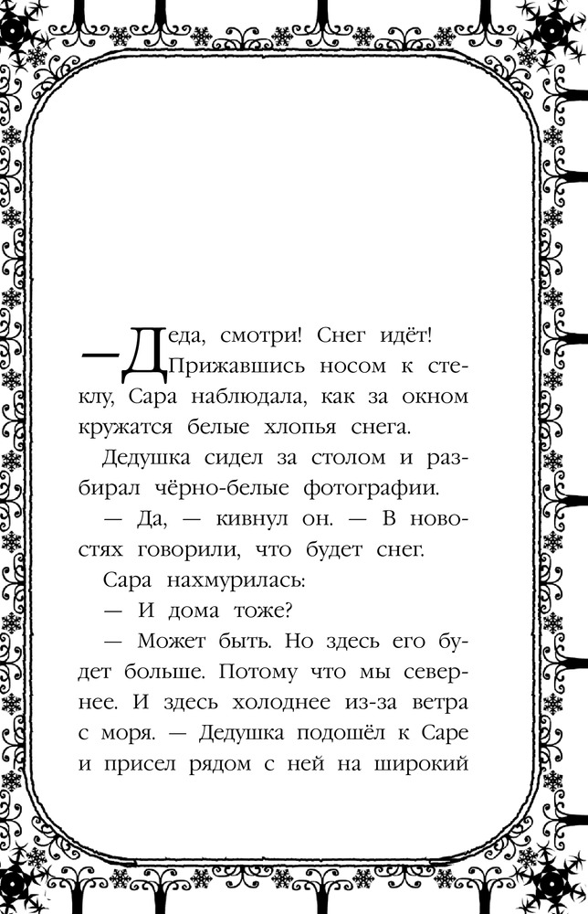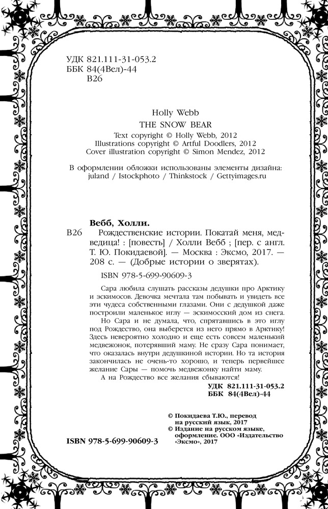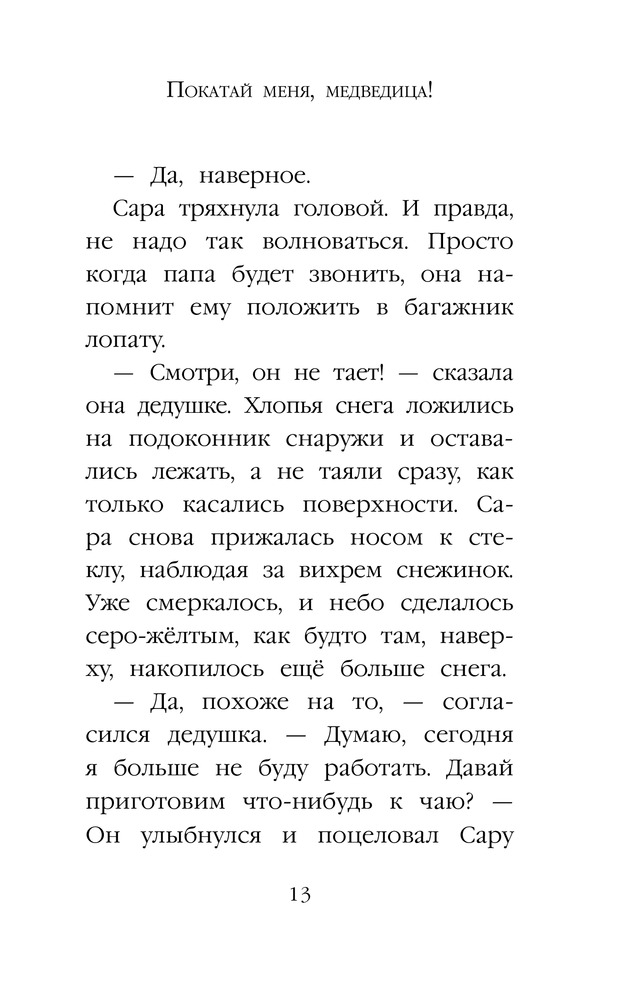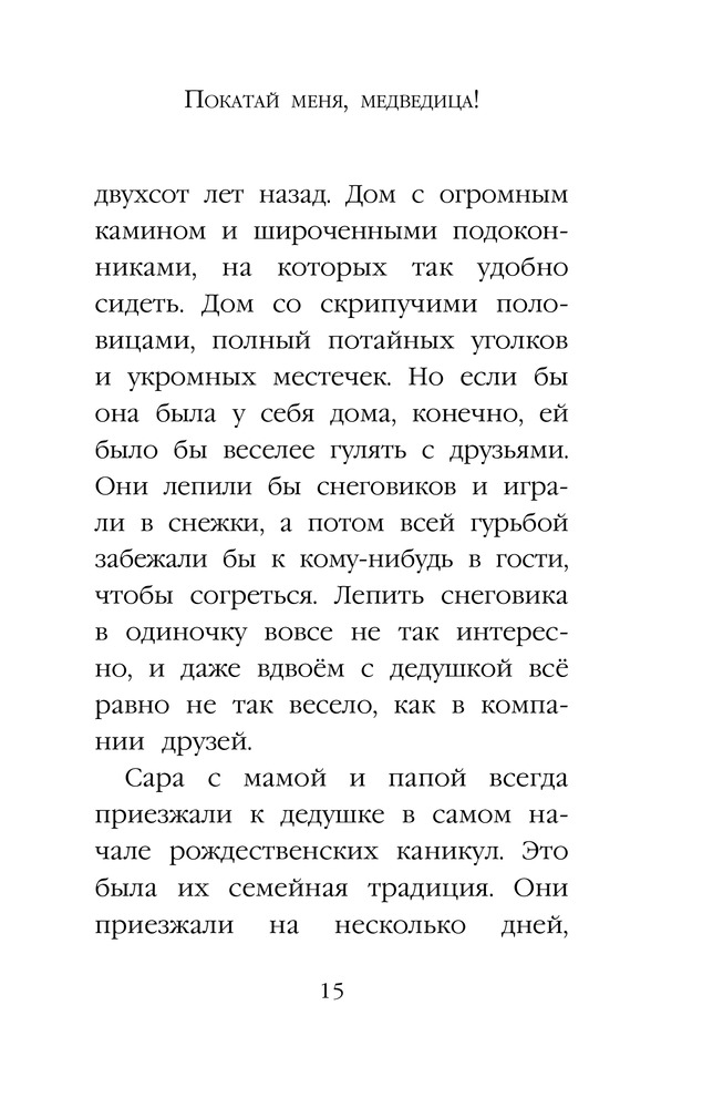Но Сара и не думала, что спрятавшись в это иглу под Рождество, она выберется из него прямо в Арктику! Здесь невероятно холодно и еще есть совсем маленький медвежонок, потерявший маму. Не сразу Сара понимает, что оказалась внутри дедушкиной истории. Но та история закончилась не очень-то хорошо, и теперь первейшее желание Сары — помочь медвежонку найти маму.