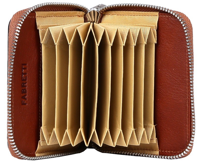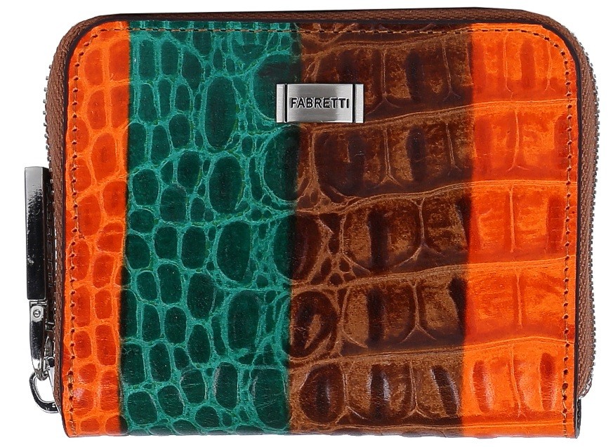 Яркая и стильная визитница от итальянского бренда Fabretti выполнена из натуральной кожи с дизайнерским тиснением под крокодила. Фурнитура, выполненная в серебре и яркое сочетание цветов делают аксессуар утонченным и изысканным. Внутри находится 10 отделений для кредитных и дисконтных карт, модель закрывается на удобную молнию.