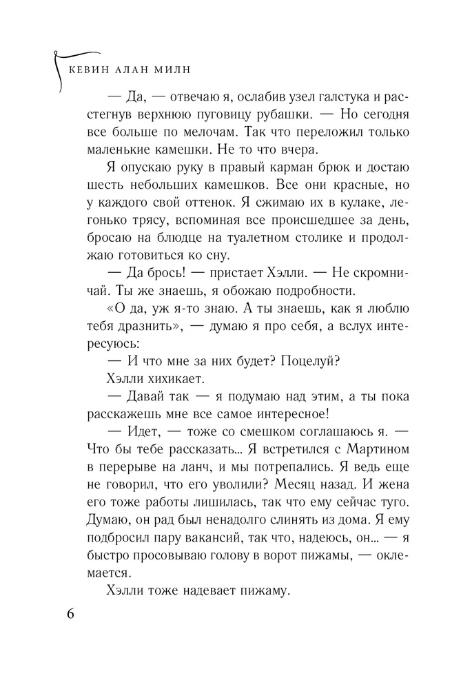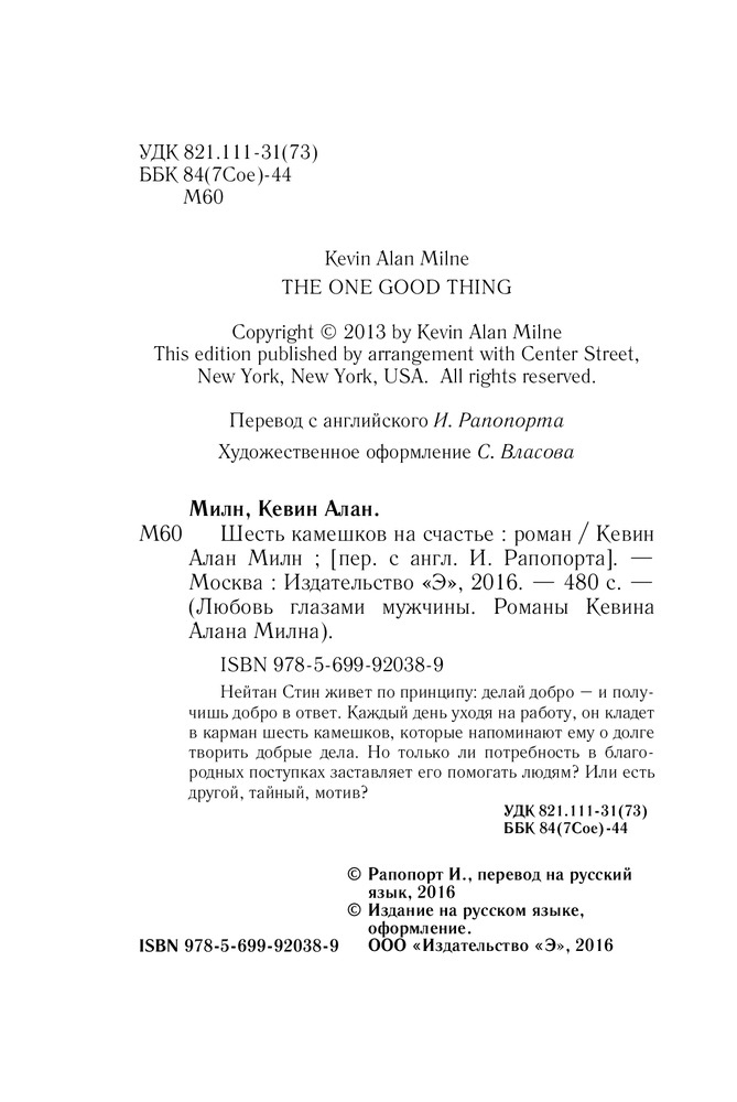 Шесть камешков на счастьеВ данный момент этот товар отсутствует в продаже. Возможно, у нас найдется аналогичный или похожий товар здесь. Серия: Любовь глазами мужчины. Романы Кевина Алана Милна Нейтан Стин живет по принципу: делай добро — и получишь добро в ответ. Каждый день уходя на работу, он кладет в карман шесть камешков, которые напоминают ему о долге творить добрые дела. Но только ли потребность в благородных поступках заставляет его помогать людям? Или есть другой, тайный, мотив? |