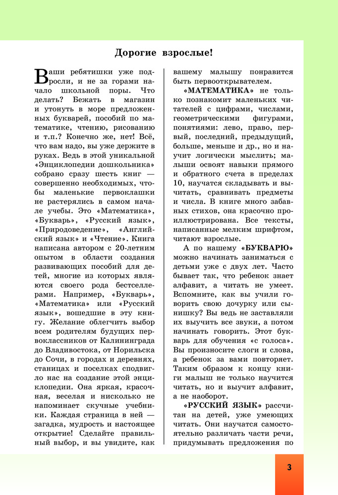 «Энциклопедия дошкольника» написана автором с многолетним опытом в области создания развивающих пособий для детей. Занятия по этой книге не требуют от родителей специальных знаний, поэтому ваш ребёнок легко пройдёт курс домашнего обучения и будет отлично подготовлен к школе.