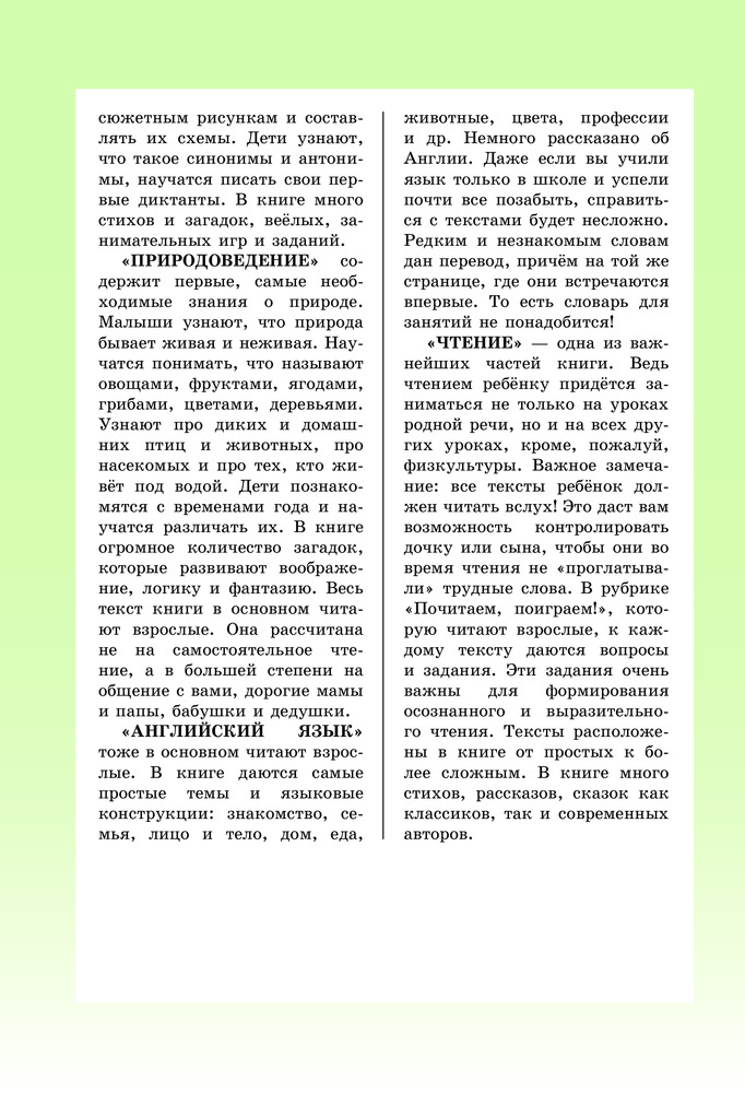Универсальная энциклопедия охватывает весь спектр дошкольного образования. Выполняя занимательные упражнения, ваш малыш расширит свои знания об окружающем мире, научится читать, считать, писать, рисовать и произнесёт свои первые слова по-английски. Более 1000 иллюстраций дополняют каждое задание и помогают лучше усвоить информацию, учиться весело и с удовольствием!