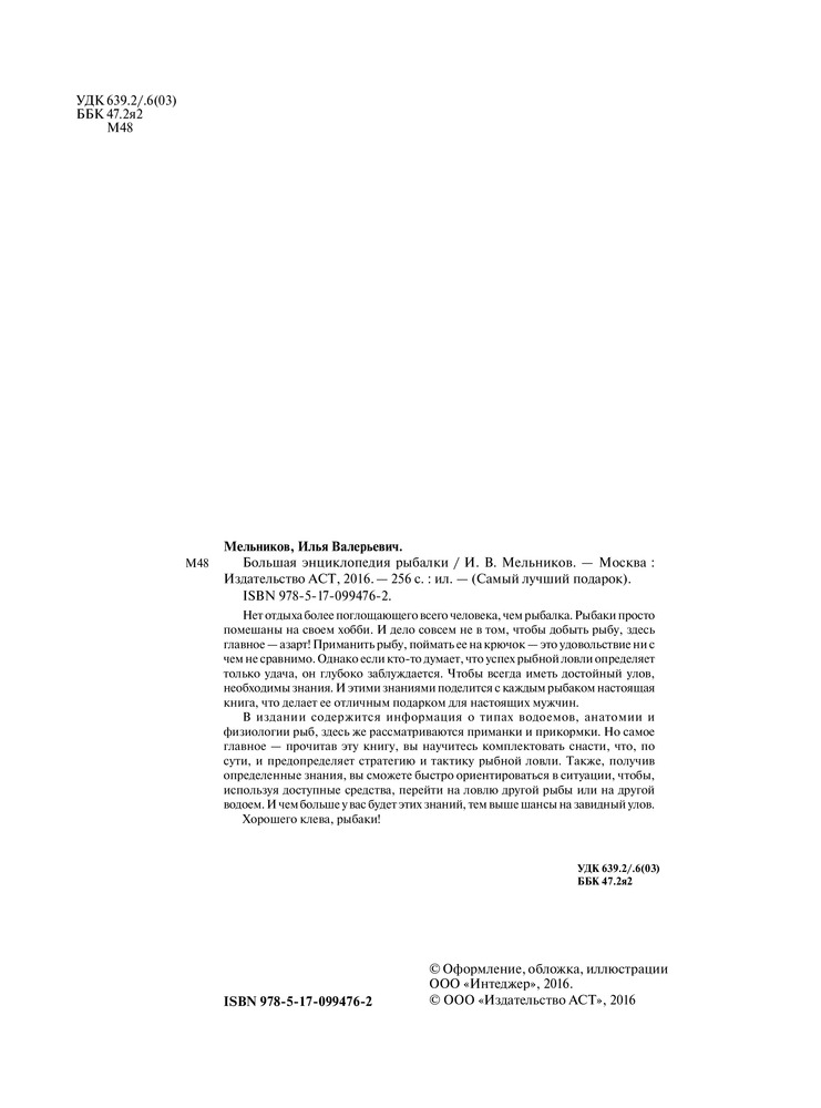 Большая энциклопедия рыбалкиВ данный момент этот товар отсутствует в продаже. Возможно, у нас найдется аналогичный или похожий товар здесь. Серия: Самый лучший подарок Нет отдыха более поглощающего всего человека, чем рыбалка. Рыбаки просто помешаны на своем хобби. И дело совсем не в том, чтобы добыть рыбу, здесь главное — азарт! Приманить рыбу, поймать ее на крючок — это удовольствие ни с чем не сравнимо. Однако если кто-то думает, что успех рыбной ловли определяет только удача, он глубоко заблуждается. Чтобы всегда иметь достойный улов, необходимы знания. И этими знаниями поделится с каждым рыбаком настоящая книга, что делает ее отличным подарком для настоящих мужчин. |