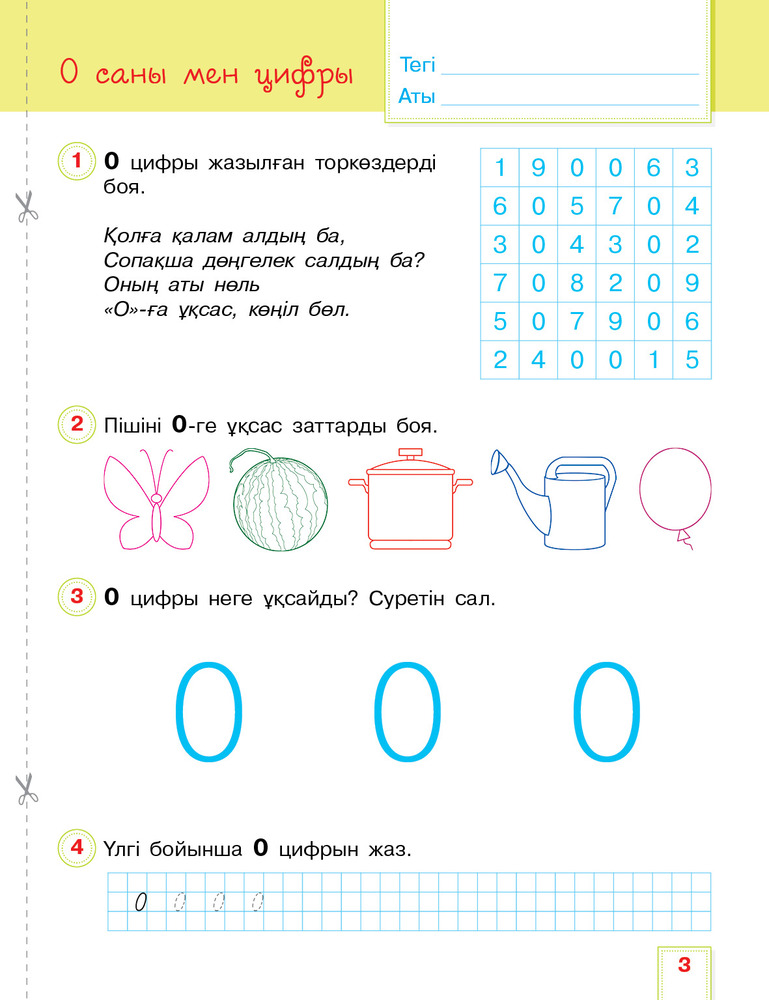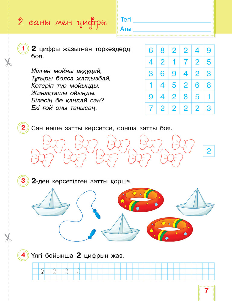 Бұл оқу құралы тапсырмалар берілген жеке карточкалар түрінде жасалған, ол карточкаларды пайдалану мектепке дейінгі дайындық процесінде балалардың сандар мен цифрлар туралы бастапқы білімді оңай меңгеруіне жол ашады. Карточкалармен жұмыс оқу әрекеті барысында өз бетінше жұмыс қабілетінің пайда болуына, графикалық дағдының, шығармашылық қабілеттің, логикалық ойдың, зейіннің, еске сақтаудың және т. б. дамуына себін тигізеді.