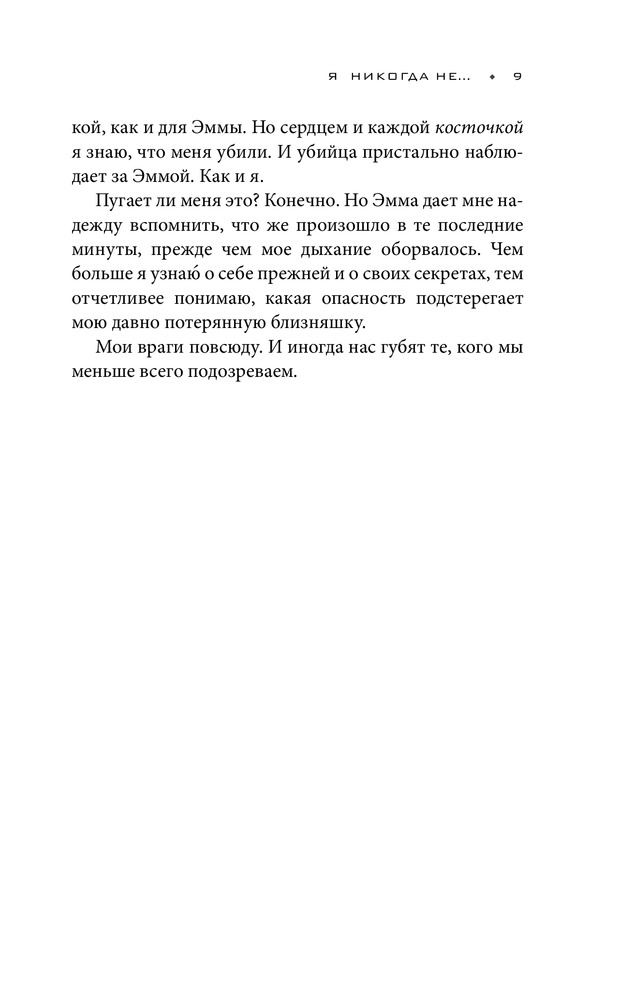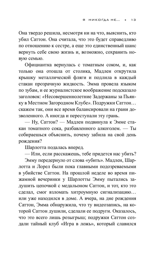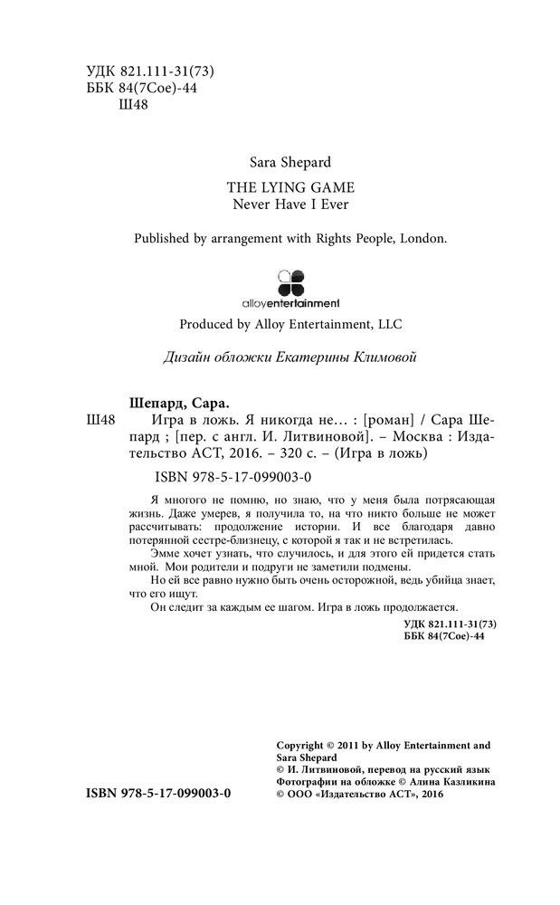 Игра в ложь. Я никогда не...В данный момент этот товар отсутствует в продаже. Возможно, у нас найдется аналогичный или похожий товар здесь. Серия: Милые обманщицы. Игра в ложь Иногда нас губят те, кого мы меньше всего подозреваем. Мои враги повсюду. Я многого не помню, но знаю, что у меня была потрясающая жизнь. Даже умерев, я получила то, на что никто больше не может рассчитывать: продолжение истории. И все благодаря давно потерянной сестре-близнецу, с которой я так и не встретилась. Эмме хочет узнать, что случилось, и для этого ей придется стать мной. Мои родители и подруги не заметили подмены. Но ей все равно нужно быть очень осторожной, ведь убийца знает, что его ищут. Он следит за каждым ее шагом. Игра в ложь продолжается. |