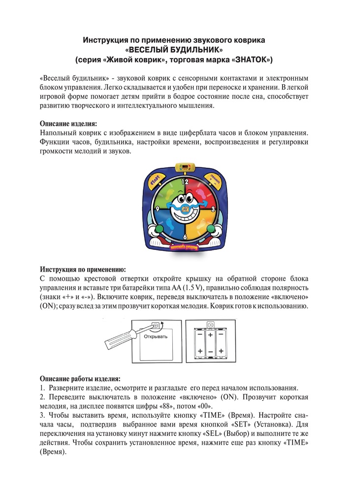 Знаток Звуковой коврик «Весёлый будильник»В данный момент этот товар отсутствует в продаже. Возможно, у нас найдется аналогичный или похожий товар здесь. Серия: Живой коврик Напольный коврик с изображением в виде циферблата часов и блоком управления. |