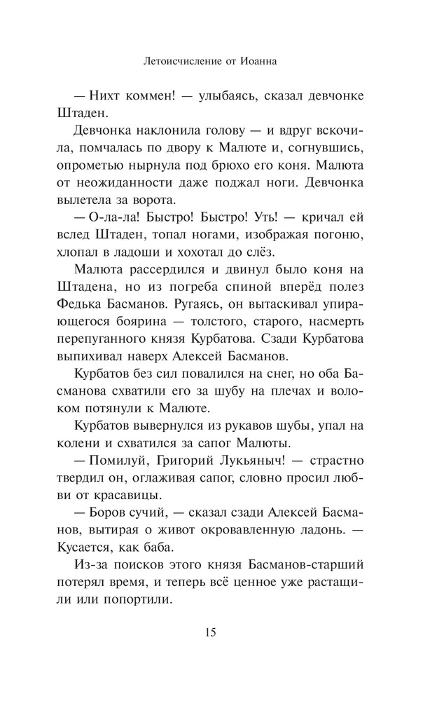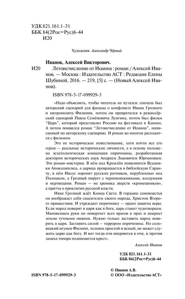 Серия: Новый Алексей Иванов «Надо объяснить, чтобы читатель не путался: сначала был авторский сценарий для фильма о конфликте Ивана Грозного и митрополита Филиппа, потом он превратился в режиссёрский сценарий Павла Семёновича Лунгина, потом был фильм „Царь“, который представлял Россию на фестивале в Каннах. А потом появился роман „Летоисчисление от Иоанна“, написанный по авторскому сценарию. И роман во многом расходится с фильмом.