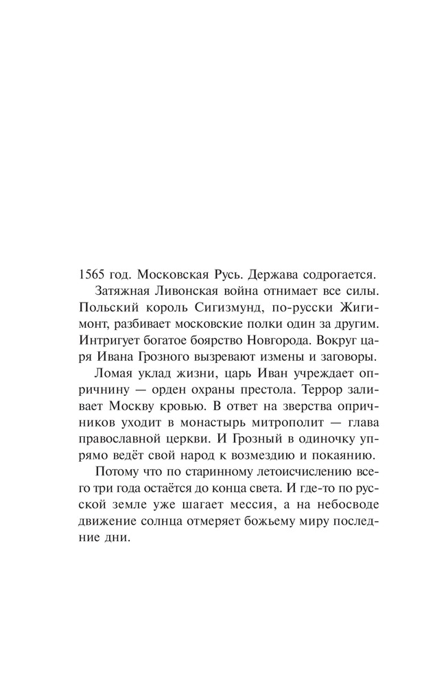 Это не историческое повествование, хотя почти все его герои — реальные исторические личности, а в основу положена эсхатологическая концепция опричнины, разработанная доктором исторических наук Андреем Львовичем Юргановым. Это роман-мистерия. В нём над Кремлём появляются Всадники Апокалипсиса, а царица превращается в библейскую Саранчу, в нём Иисус хоронит русских ратников, порубленных под Полоцком, а Грозный пирует с чернокнижниками, колдунами и мертвецами. Роман — не хроника зверств „кромешников“, а притча о проклятии русской власти.