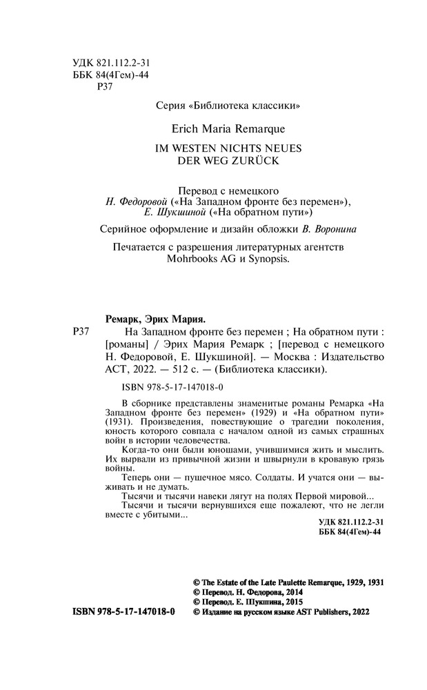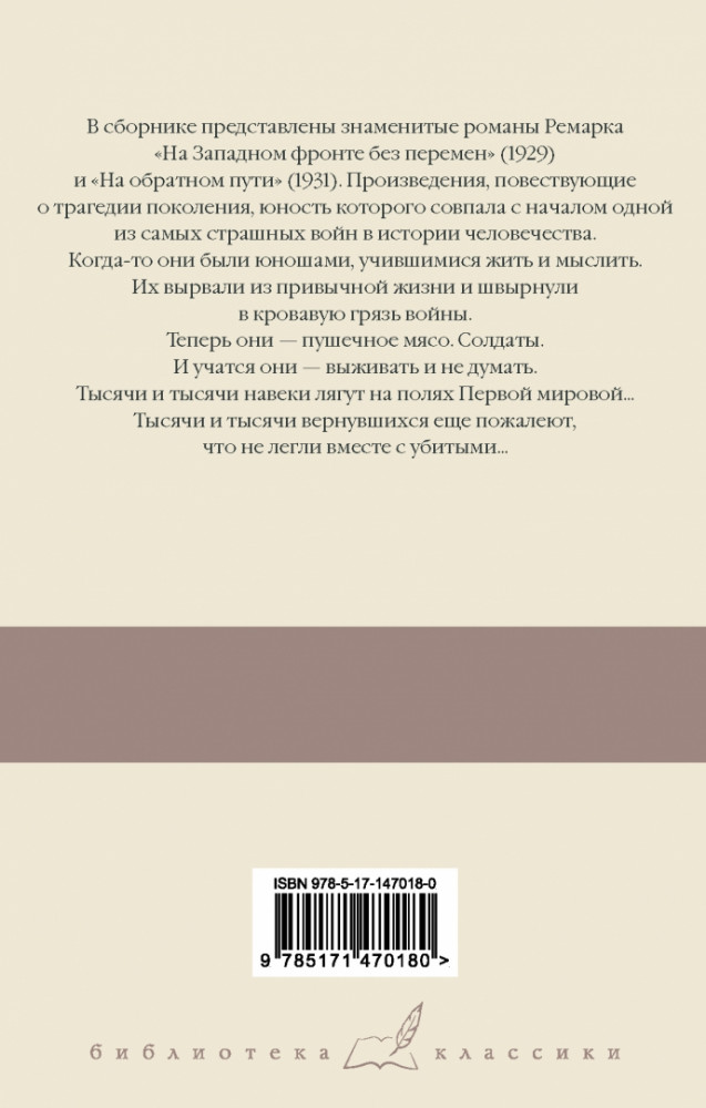 💳 Оплатить за товар можно при получении 🇰🇿 Есть бесплатная доставка по Казахстану 🎁 Копите бонусы с каждой покупки Серия: Библиотека классики В сборнике представлены знаменитые романы Ремарка «На Западном фронте без перемен» (1929) и «На обратном пути» (1931). Произведения, повествующие о трагедии поколения, юность которого совпала с началом одной из самых страшных войн в истории человечества. |