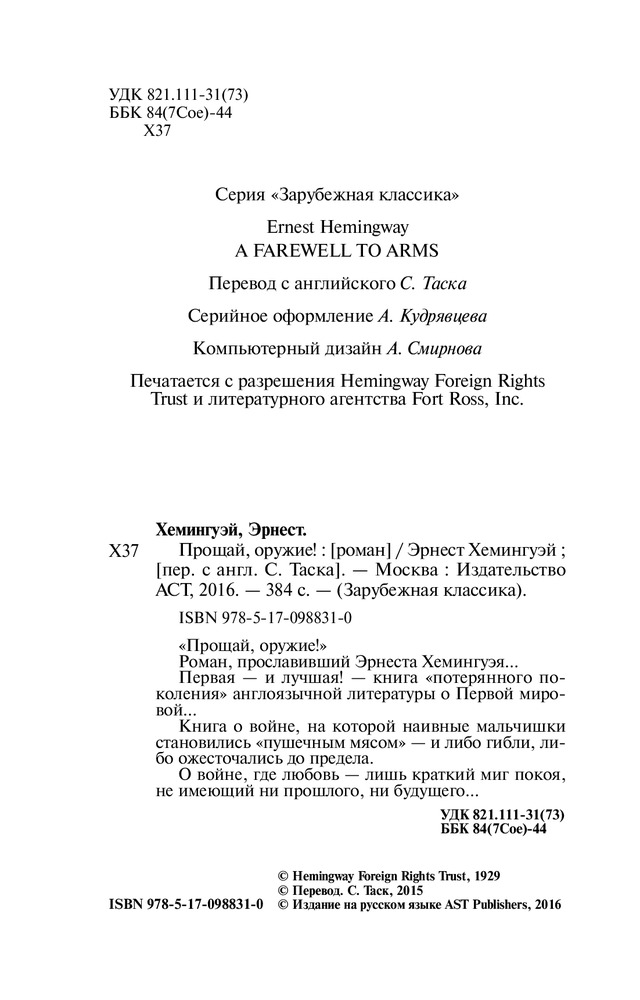 | Прощай, оружие!В данный момент этот товар отсутствует в продаже. Возможно, у нас найдется аналогичный или похожий товар здесь. Серия: Зарубежная классика «Прощай, оружие!» |