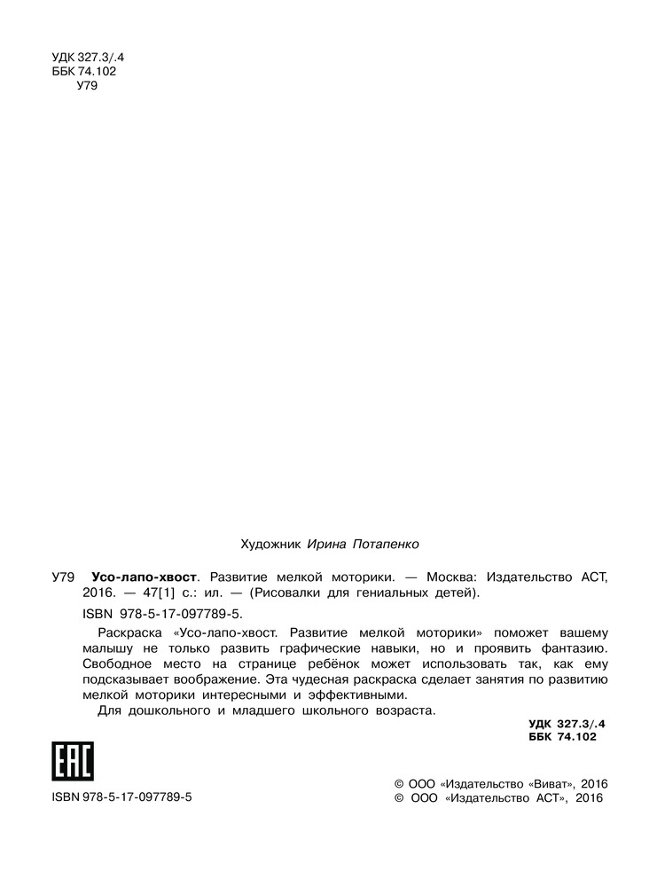 Усо-лапо-хвост. Развитие мелкой моторикиВ данный момент этот товар отсутствует в продаже. Возможно, у нас найдется аналогичный или похожий товар здесь. Серия: Рисовалки для гениальных детей Раскраска «Усо-лапо-хвост. Развитие мелкой моторики» поможет вашему малышу не только развить графические навыки, но и проявить фантазию. Свободное место на странице ребёнок может использовать так, как ему подсказывает воображение. Эта чудесная раскраска сделает занятия по развитию мелкой моторики интересными и эффективными. |