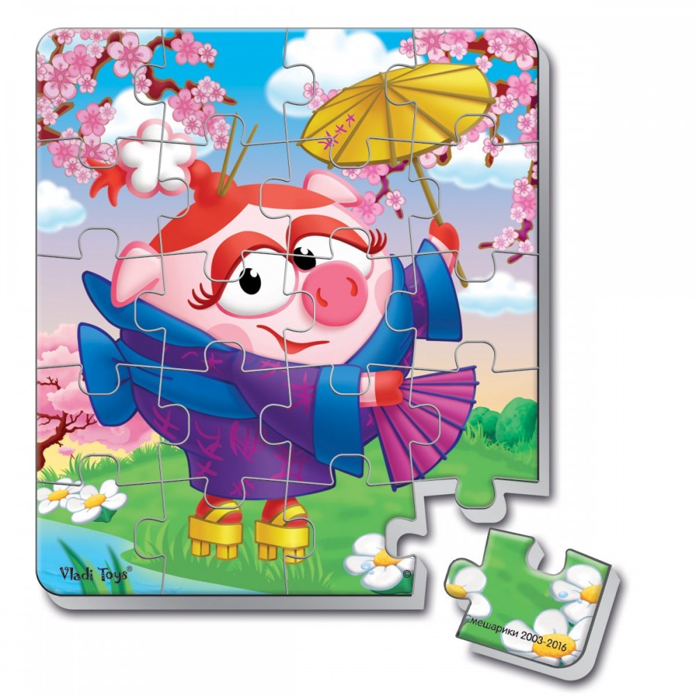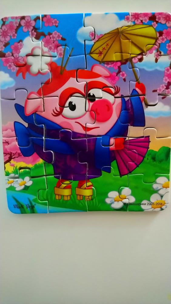 Красивый пазл, интересный для детей, популярный Смешарик. Только детальки мелкие, использовать надо примерно с трёх лет. Однако если собирать пазл со взрослыми, можно и в более раннем возрасте. Выполнен качественно.