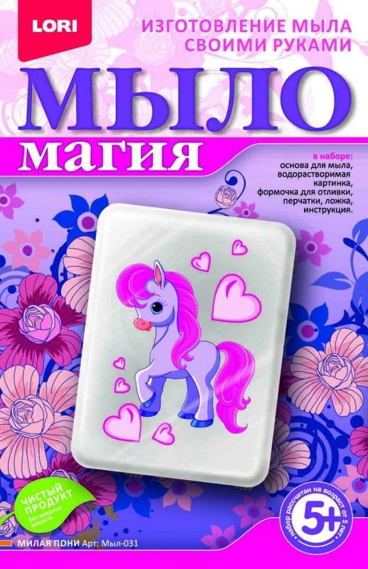 Комплект: цветная основа для мыла, формочка для отливки, перчатки, ложка.