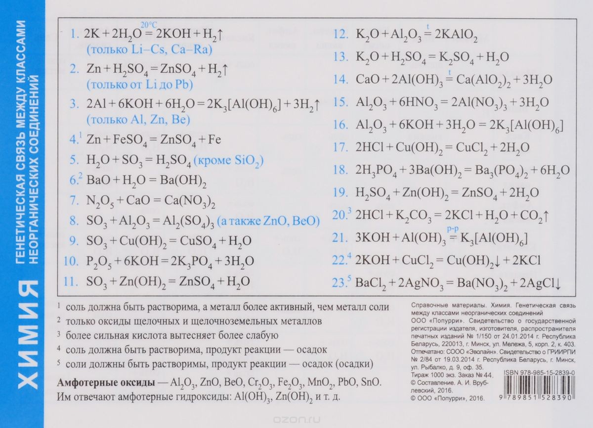Справочные материалы: Химия. Генетическая связь между классами неорганических соединений-25% +20 ламинированная компактный размер удобный формат полезная шпаргалка примеры реакций без ошибок