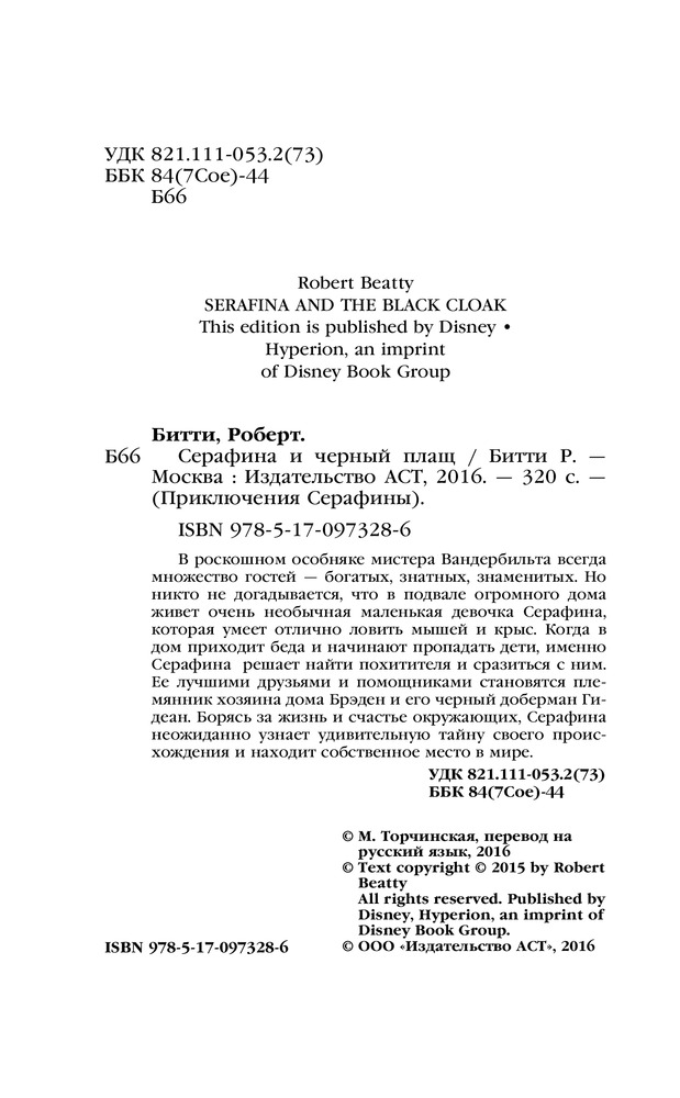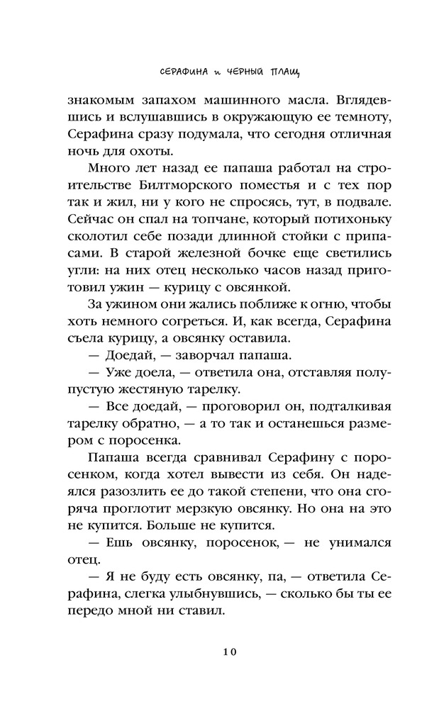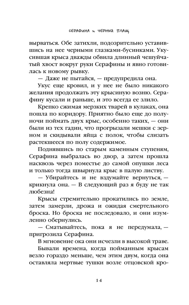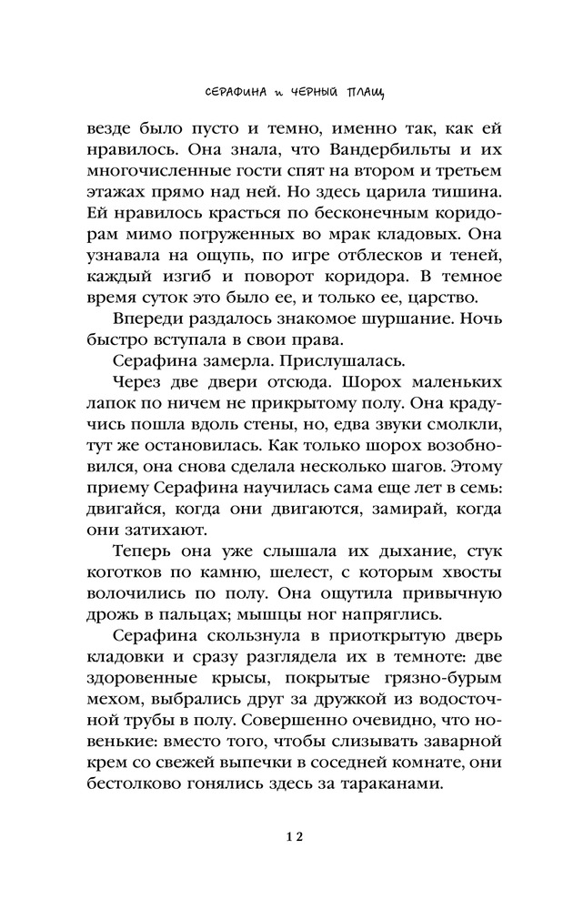 Серафина и чёрный плащВ данный момент этот товар отсутствует в продаже. Возможно, у нас найдется аналогичный или похожий товар здесь. Серия: Приключения кота Помпона В роскошном особняке мистера Вандербильта всегда множество гостей — богатых, знатных, знаменитых. Но никто не догадывается, что в подвале огромного дома живет очень необычная маленькая девочка Серафина, которая умеет отлично ловить мышей и крыс. Когда в дом приходит беда и начинают пропадать дети, именно Серафина решает найти похитителя и сразиться с ним. Ее лучшими друзьями и помощниками становятся племянник хозяина дома Брэден и его черный доберман Гидеан. Борясь за жизнь и счастье окружающих, Серафина неожиданно узнает удивительную тайну своего происхождения и находит собственное место в мире. |
