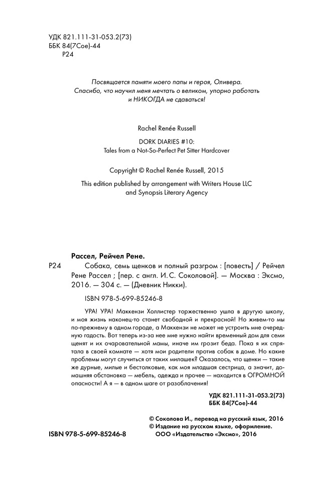 Собака, семь щенков и полный разгромВ данный момент этот товар отсутствует в продаже. Возможно, у нас найдется аналогичный или похожий товар здесь. Серия: Дневник Никки УРА! УРА! Маккензи Холлистер торжественно ушла в другую школу, и моя жизнь наконец-то станет свободной и прекрасной! Но живем-то мы по-прежнему в одном городе, а Маккензи не может не устроить мне очередную гадость. Вот теперь из-за нее мне нужно найти временный дом для семи щенят и их очаровательной мамы, иначе им грозит беда. Пока я их спрятала в своей комнате — хотя мои родители против собак в доме. Но какие проблемы могут случиться от таких милашек? Оказалось, что щенки — такие же дурные милые и бестолковые, как моя младшая сестрица, а значит, домашняя обстановка — мебель, одежда и прочее — находится в ОГРОМНОЙ опасности! А я — в одном шаге от разоблачения! |