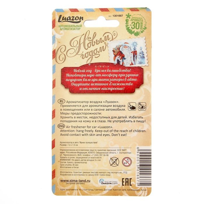 Luazon Ароматизатор в авто «Ярких путешествий», тропические фруктыВ данный момент этот товар отсутствует в продаже. Возможно, у нас найдется аналогичный или похожий товар здесь. Украсьте свой автомобиль ярким и забавным ароматизатором с символом наступающего года — петухом. Изделие принесёт удачу, а благоухание создаст атмосферу праздника в салоне. |