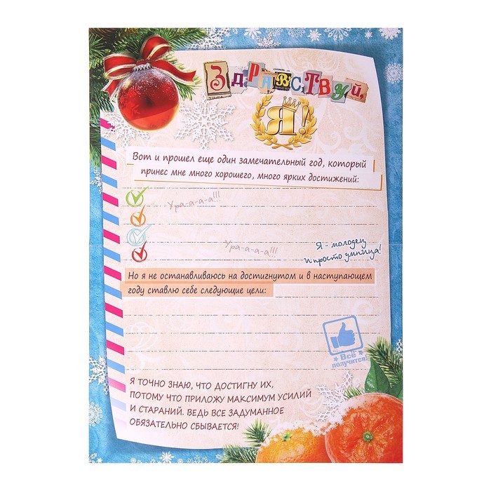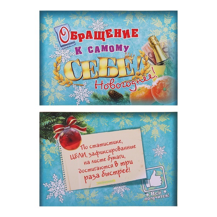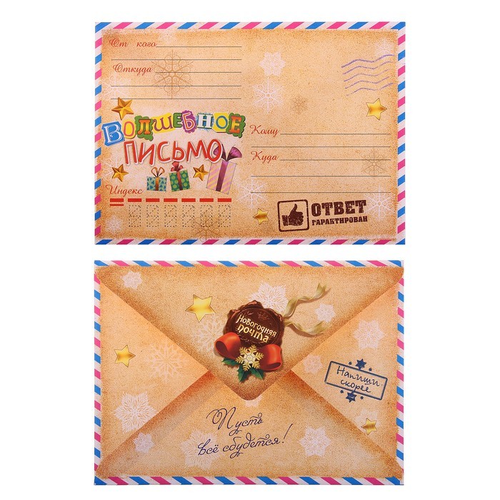 Письмо новогоднее с конвертом «Обращение к самому себе»В данный момент этот товар отсутствует в продаже. Возможно, у нас найдется аналогичный или похожий товар здесь. У каждого есть заветное желание. Как узнать Деду Морозу о том, что же вы мечтаете получить в подарок. У нас есть решение! Письмо новогоднее с конвертом "Дедушке Морозу" в эксклюзивном дизайне донесёт ваше послание, и оно непременно исполнится. Настоящий ответ от Деда Мороза можно получить только в случае, если письмо будет отправлено по всем требованиям волшебной почты (в конверте и с почтовыми марками) по таким адресам: |