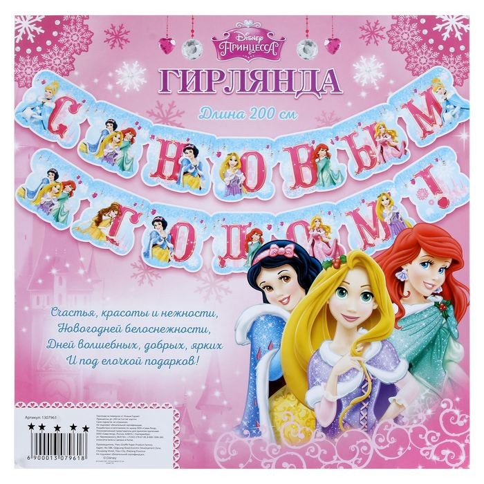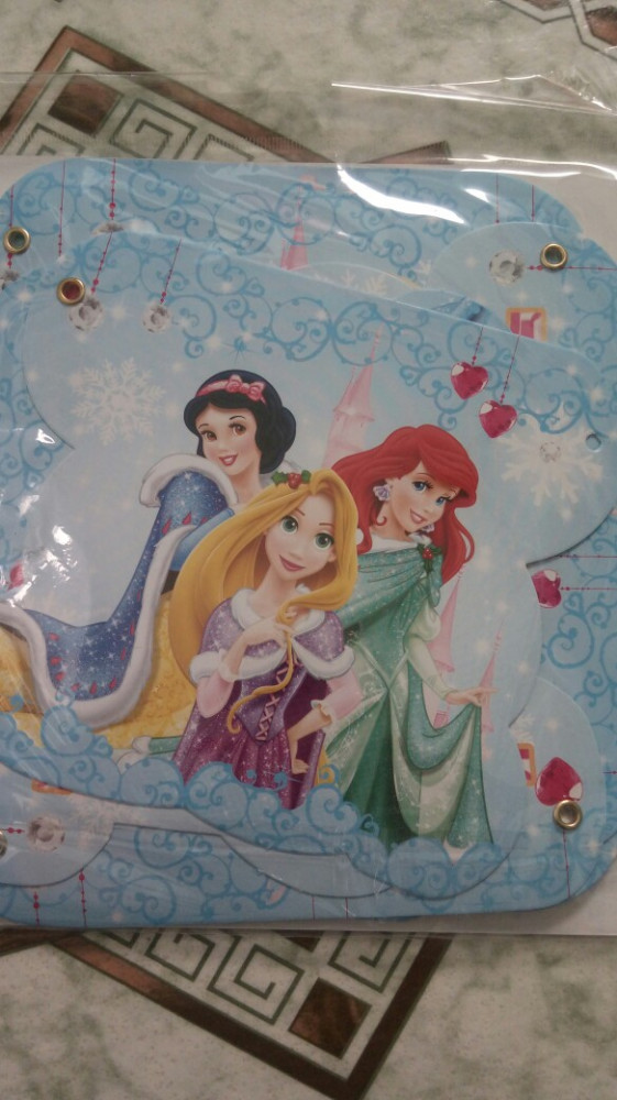 Гирлянда выполнена из плотного картона. Имеет маленькие, кругленькие металлические крепления. Благодаря которым каждая буква крутится, за счет них гирлянду можно фокусировать и вешать как вам удобно. Яркая, красочная. Теплая. Создает ощущение комфорта. Изображены диснеевские героини: Золушка, Белль, Белоснежка, Ариэль, Рапунцель и Аврора. К покупке рекомендую.