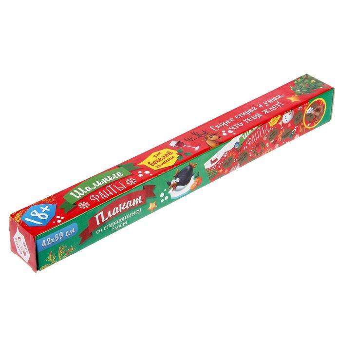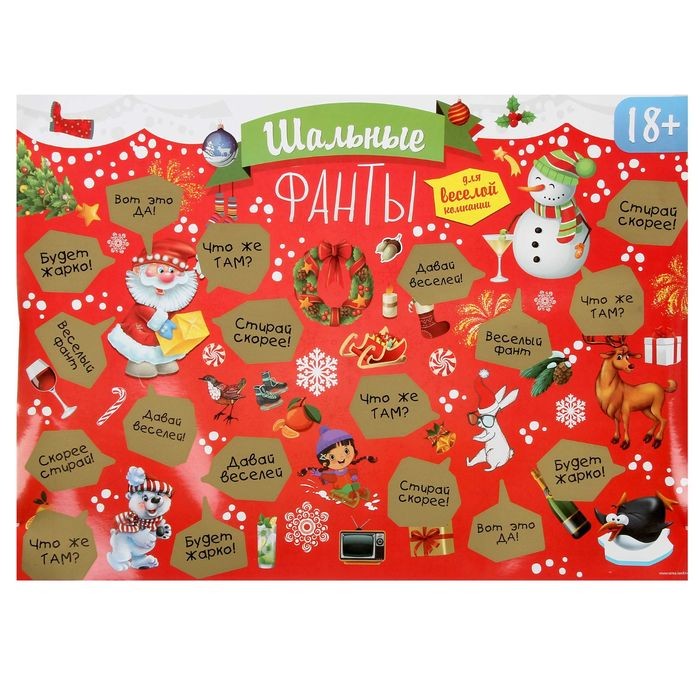 Прекрасно провели время перед встречей Нового Года благодаря этому плакату. Задания смешные, не пошлые, участвовали даже дети. Советую.