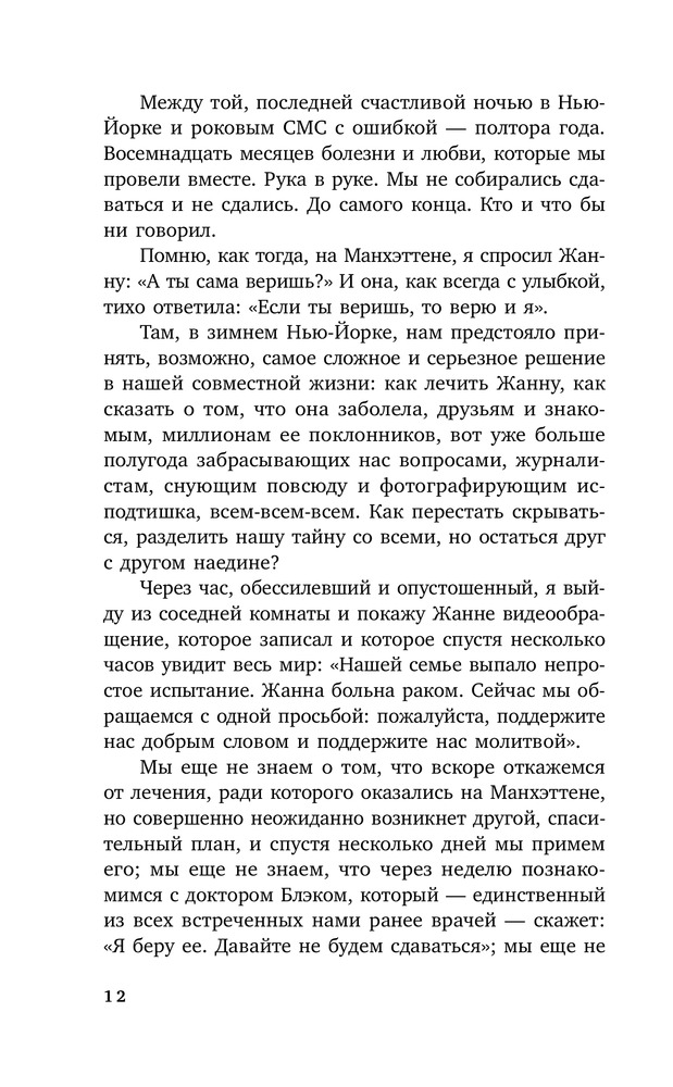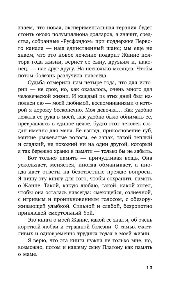 Я тоже не являюсь ярой поклонницей Жанны Фриске, но как только узнала, что она заболела, переживала за неё, как за родного человека. Следила за её историей по СМИ, но похоже, что больше сплетен и интриг, чем правды. Почему-то именно книге я склонна верить, потому как Дмитрий Шепелев находился рядом с Жанной от самого начала и практически до самого конца и только он может знать, как на самом деле обстояли дела. Очень впечатлил язык написания Дмитрия, насколько тонко и эмоционально он смог передать все свои чувства и мысли. Конечно, в конце прочтения книги не возможно было сдержать слёз. Очень рекомендую. Книга заставляет задуматься о многом и ценить, что мы имеем сейчас и здесь.