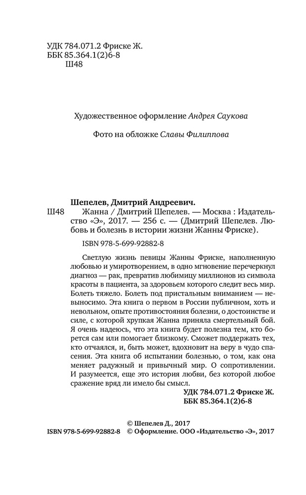 ЖаннаВ данный момент этот товар отсутствует в продаже. Возможно, у нас найдется аналогичный или похожий товар здесь. Серия: Дмитрий Шепелев. Любовь и болезнь в истории жизни Жанны Фриске Светлую жизнь певицы Жанны Фриске, наполненную любовью и умиротворением, в одном мгновение перечеркнул диагноз - рак, превратив любимицу миллионов из символа красоты в пациента, за здоровьем которого следит весь мир. |