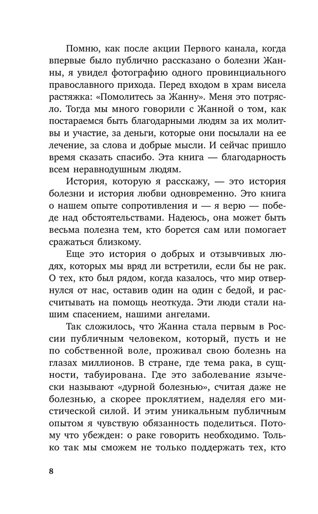 Интересно и легко написано. Хорошо переданы чувства. К Жанне и Дмитрию испытываю большое уважение и сочувствие. Стоит прочесть книгу и осознать ценность жизни и каждого дня.