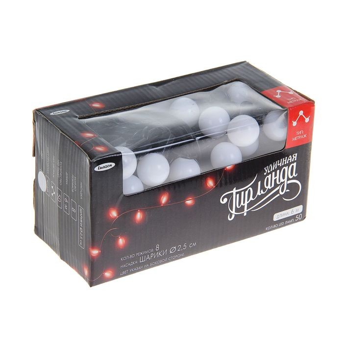 | Luazon Гирлянда «Метраж» с насадкой «Шарики 2,5 см», 6 м, LED-50, белый, нить темная, 8 режимов