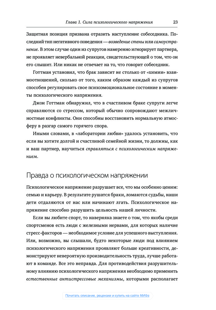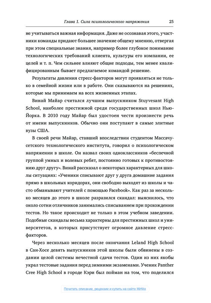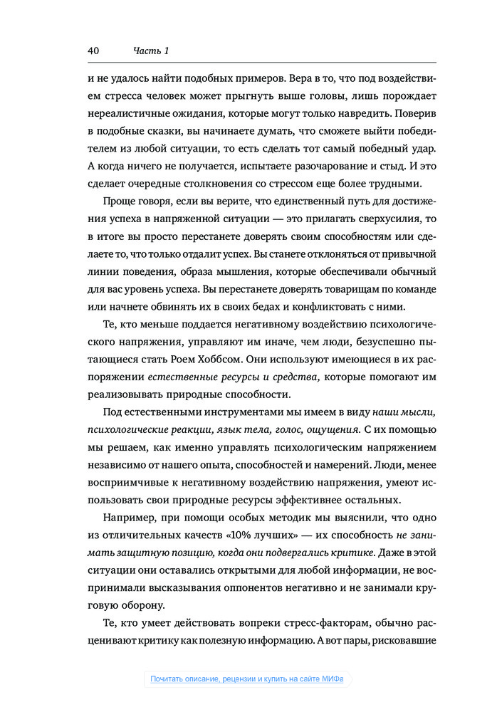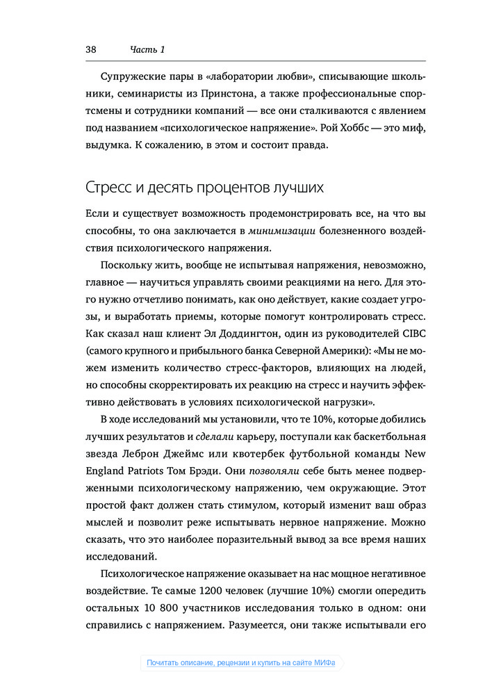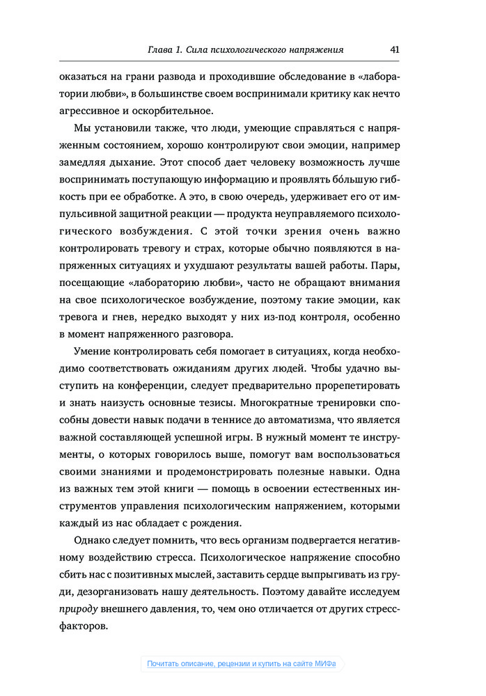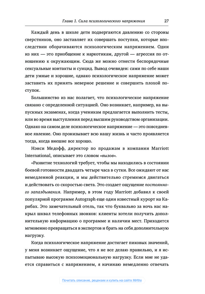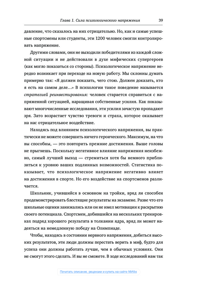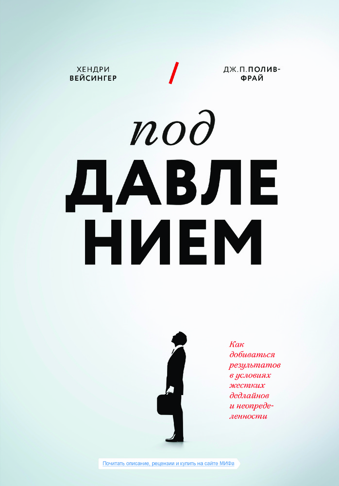 Очень интересная и полезная книга. Авторы подошли очень основательно к данной теме. Каждый человек испытывает напряжение, кого-то вынуждают обстоятельства, начальство, конкуренты и т. д., кто-то сам ставит себя в положение напряжения. Победить психологическое напряжение невозможно, возможно изменить наше отношение к давлению оказанному нам. Почему многие в браке живут счастливо и долго, а другие нет. Пары совместно живущие долго, это семьи, в которых муж и жена испытали вместе финансовые трудности, проблемы на работе и многое другое. Семьи, которые не смогли пройти через все препятствия, распадаются. Соглашусь, что "Под давлением" - это, как сказано в описании, самоучитель для успешной работы в условиях психологического напряжения, она всегда должна лежать под рукой. Дж. П. Полив-Фрай и Хендри Вейсингер очень досконально изучили тему на основе статей, экспериментов проведенных ими и другими ученными, книг по изучению нашего мозга, и истории войн или просто истории. Книга делится на три части. В первой части идет описание психологического напряжения, рассказы людей столкнувшихся с психологическим напряжением, разница между стрессом и напряжением, и как наш мозг воспринимает давление. Во второй части описана суть про 22 метода преодоления психологического напряжения и рассказы про спортсменов, бизнесменов, военных, ученых, столкнувшихся с давлением, оказанным на них, и нашедших выход из данной ситуации. Третья часть "Рыцарский щит" - в ней говорится о четырех составляющих, которые помогут преодолеть давление, такие как: Уверенность, Оптимизм, Упорство и Энтузиазм. Все, что прочитал, я не могу передать, скажу, что лучше её прочитать самостоятельно. Эта книга стоит того, чтобы лежать на Вашей книжной полке.
