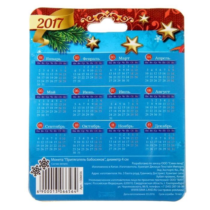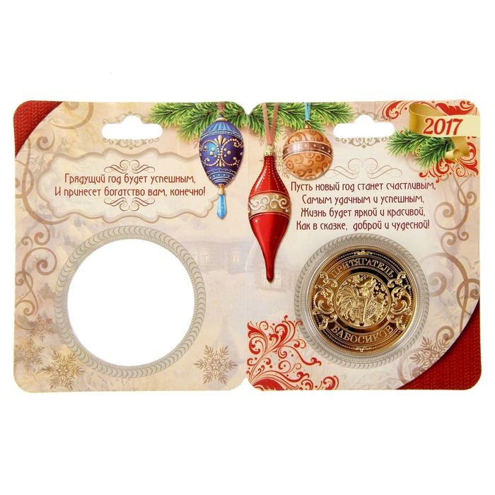 Сувенир изготовлен из металла и преподносится на поздравительной открытке с тёплыми новогодними пожеланиями.