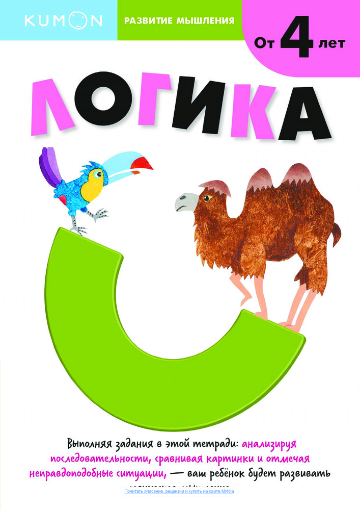 Развитие мышления. ЛогикаВ данный момент этот товар отсутствует в продаже. Возможно, у нас найдется аналогичный или похожий товар здесь. Серия: Рабочая тетрадь KUMON В этой тетради собраны задания, которые помогут развить логическое мышление ребёнка: анализируем последовательности, сравниваем картинки, отмечаем неправдоподобные ситуации. |