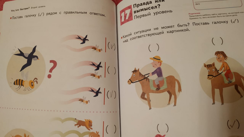 Даже для родителей полезно: выполняли задание, кто быстрее: пчела или ласточка - сами задумались, а вот дочка 4 года сразу отреагировала: "Конечно, ласточка". А еще очень понравились задания на правду или вымысел. Качество очень хорошее: листы плотные, но при этом легко отделяются, если захотите выдавать задания понемногу. Это самое трудное - не дать ребенку все задания сразу. Рекомендую.