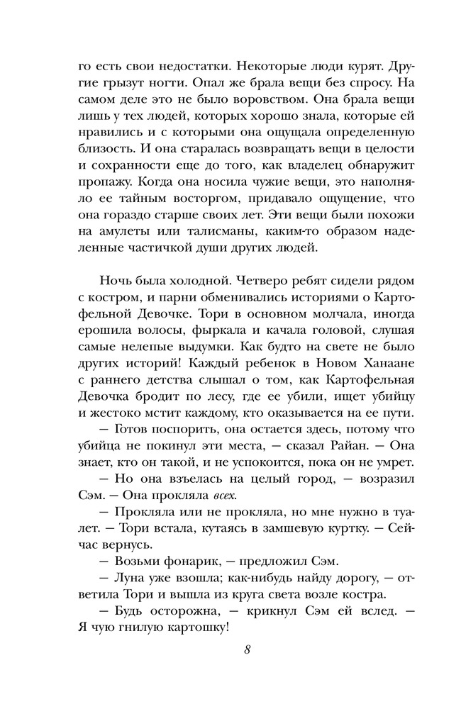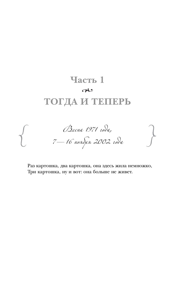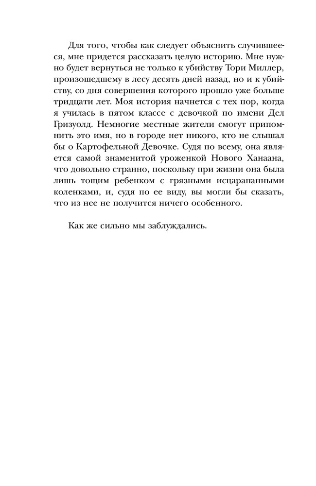 Очень интересная, захватывающая книга. Немного страшная, жуткая. Весь день думаешь об этой книге, не могла оторваться. С пролога захватывает уже Раз картошка, два картошка, она здесь жила немножко, Три картошка, ну и вот: она больше не живет.
