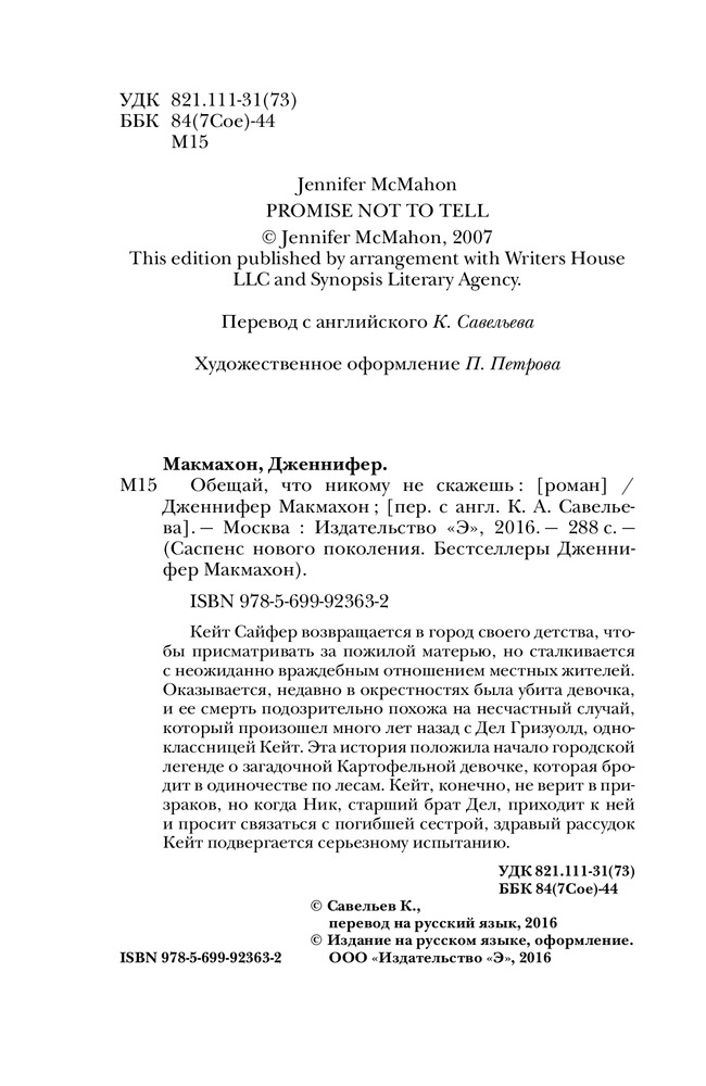 Обещай, что никому не скажешьВ данный момент этот товар отсутствует в продаже. Возможно, у нас найдется аналогичный или похожий товар здесь. Серия: Саспенс нового поколения. Бестселлеры Дженнифер Макмахон Кейт Сайфер возвращается в город своего детства, чтобы присматривать за пожилой матерью, но сталкивается с неожиданно враждебным отношением местных жителей. Оказывается, недавно в окрестностях была убита девочка, и ее смерть подозрительно похожа на несчастный случай, который произошел много лет назад с Дел Гризуолд, одноклассницей Кейт. Эта история положила начало городской легенде о загадочной Картофельной девочке, которая бродит в одиночестве по лесам. Кейт, конечно, не верит в призраков, но когда Ник, старший брат Дел, приходит к ней и просит связаться с погибшей сестрой, здравый рассудок Кейт подвергается серьезному испытанию. |