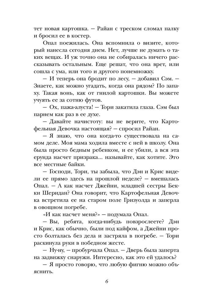 Я, поверив, что это тоже самое, что и "Люди зимы", так уверенно ждала мистической концовки, что даже не подумала вычислять убийцу))) Книга гораздо меньше, чем ЛЗ, но ни чуть не хуже! Я прочитала её за 5 часов, но даже за это время Макмахон сумела полностью погрузить меня в таинственную атмосферу событий и нынешних, и прошлых времен! Я, наверное, никогда не пойму почему дети такие злые??? Я вот была не такая, нормальная была)) На странные вещи автор обращает внимание, то снег, теперь картошка)) Раз картошка, два картошка, она здесь жила немножко. Три картошка, ну и вот: она больше не живет..