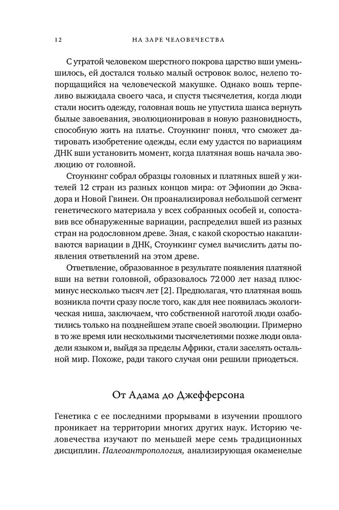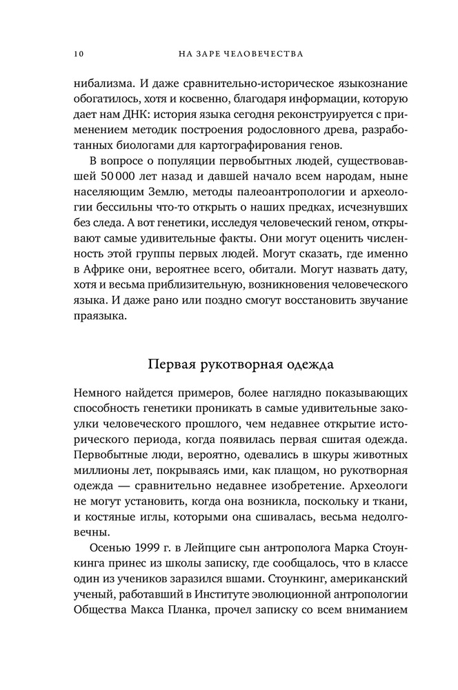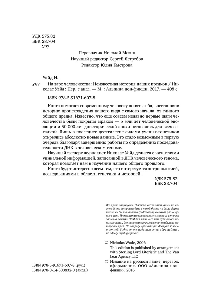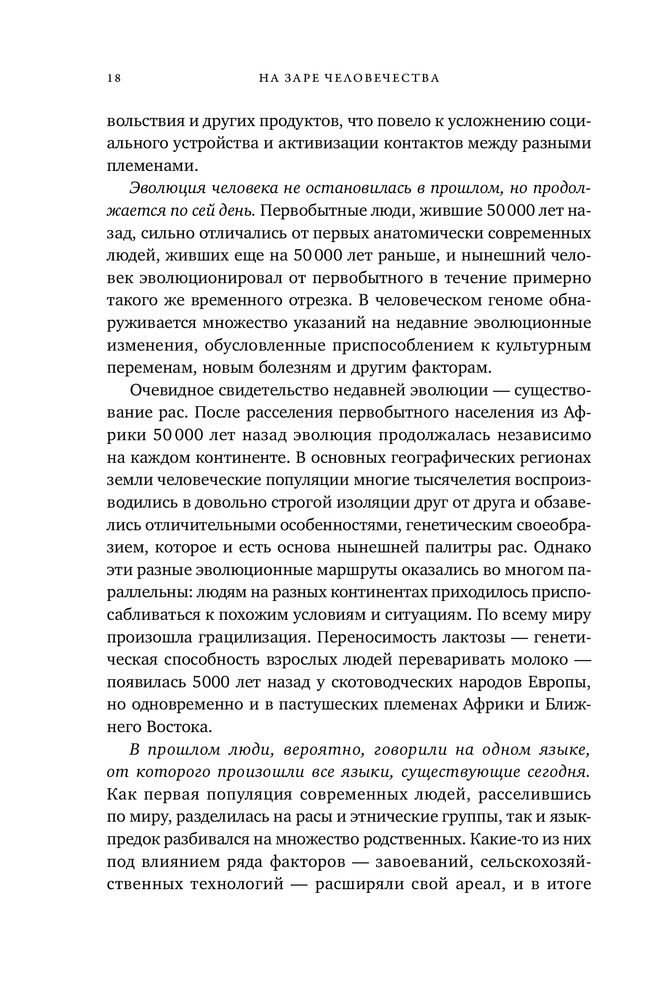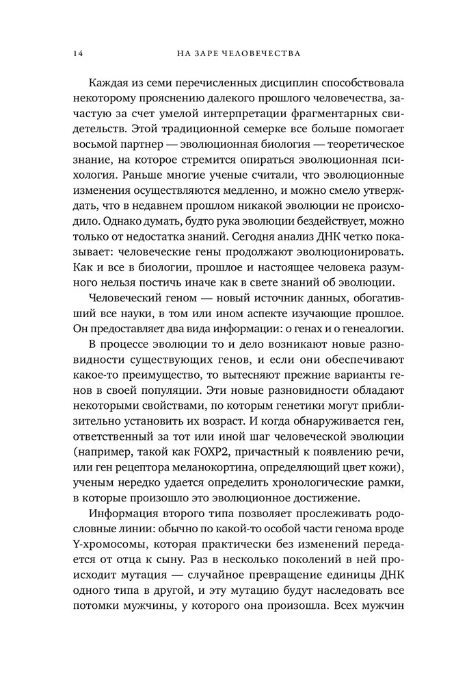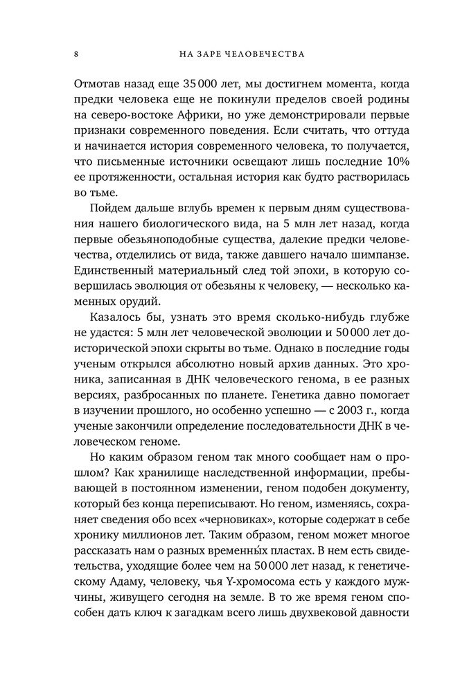 На заре человечества. Неизвестная история наших предковВ данный момент этот товар отсутствует в продаже. Возможно, у нас найдется аналогичный или похожий товар здесь. Книга помогает современному человеку понять себя, восстановив историю происхождения нашего вида с самого начала, от единого общего предка. Известно, что еще совсем недавно первые шаги человечества были покрыты мраком — 5 млн лет человеческой эволюции и 50 000 лет доисторической эпохи оставались для всех загадкой. Лишь в последнее десятилетие силами ученых-генетиков открылись абсолютно новые данные. Это стало возможным в первую очередь благодаря завершению работы по определению последовательности ДНК в человеческом геноме. |
