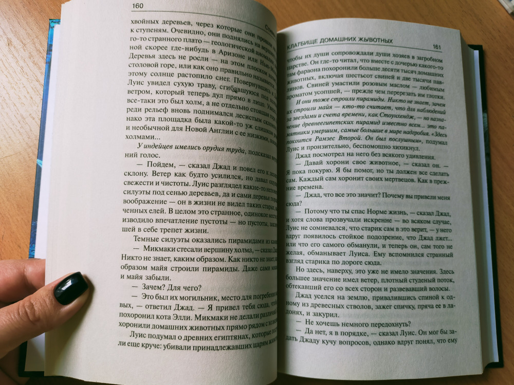 Книга пришла в хорошем состоянии, читать удобно. О содержании, это же Кинг. Это на века. Обожаю его. Так как пишет Кинг, так никто не может. Захватывает с первых страниц. Кинг великолепен. В своих романах раскрывает все стороны жизни. Особенно тяжело для меня было читать места, где родители потеряли своего сына. Так живо и реалистично описано, это не передать. Надо читать.