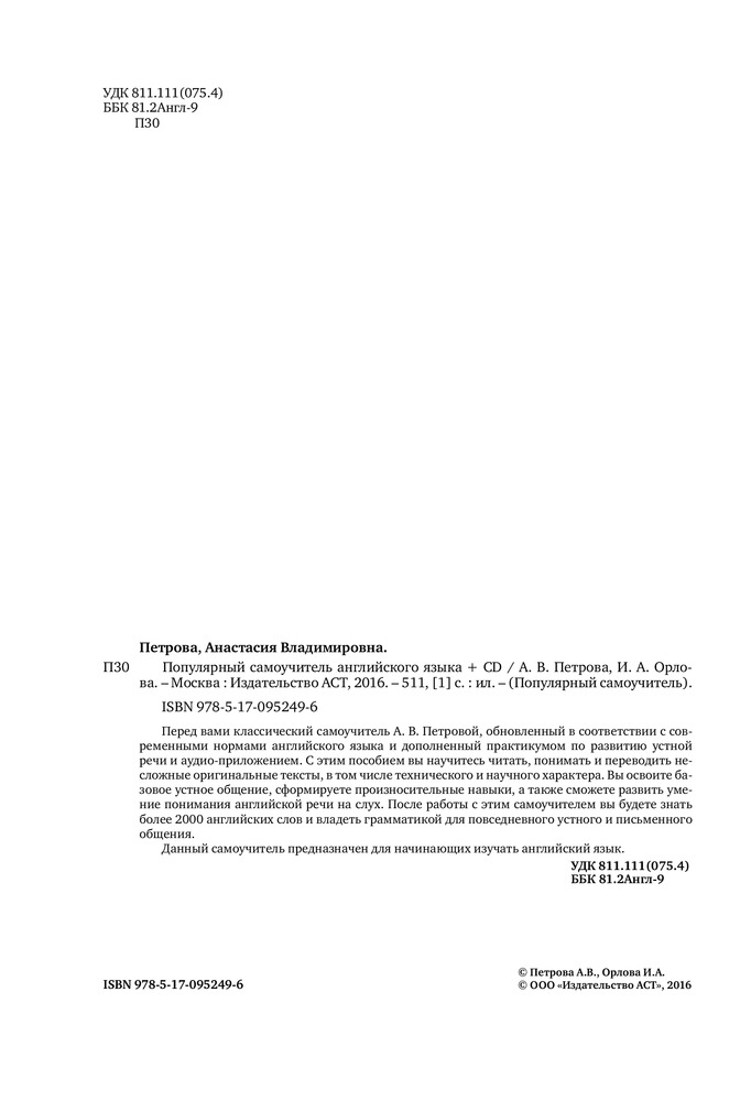 Популярный самоучитель английского языка (+CD)Петрова Анастасия Владимировна В данный момент этот товар отсутствует в продаже. Возможно, у нас найдется аналогичный или похожий товар здесь. Серия: Популярный самоучитель Перед вами классический самоучитель А.В. Петровой, обновленный в соответствии с современными нормами английского языка и дополненный практикумом по развитию устной речи и аудио-приложением. С этим пособием вы научитесь читать, понимать и переводить несложные оригинальные тексты, в том числе технического и научного характера. Вы освоите базовое устное общение, сформируете произносительные навыки, а также сможете научиться понимать английскую речь на слух. После работы с этим самоучителем вы будете знать более 2000 английских слов и владеть грамматикой для повседневного устного и письменного общения. |