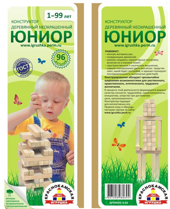 Краснокамская игрушка Деревянный конструктор «Юниор», 96 деталейВ данный момент этот товар отсутствует в продаже. Возможно, у нас найдется аналогичный или похожий товар здесь. «Юниор» - деревянный конструктор. Состоит из 96 брусков прямоугольной формы. Все детали неокрашены, чтобы ребенок смог в полной мере ощутить запах древесины, увидеть его фактуру и рисунок. Каждая фигура обработана так, что малыш не сможет поцарапаться или пораниться, конструктор абсолютно безопасен, даже если ребенок решит его попробовать на зубок.Из брусков ребенок может строить дома, замки, фигуры, развивая свои творческие навыки, ощущения равновесия и мелкую моторику. |