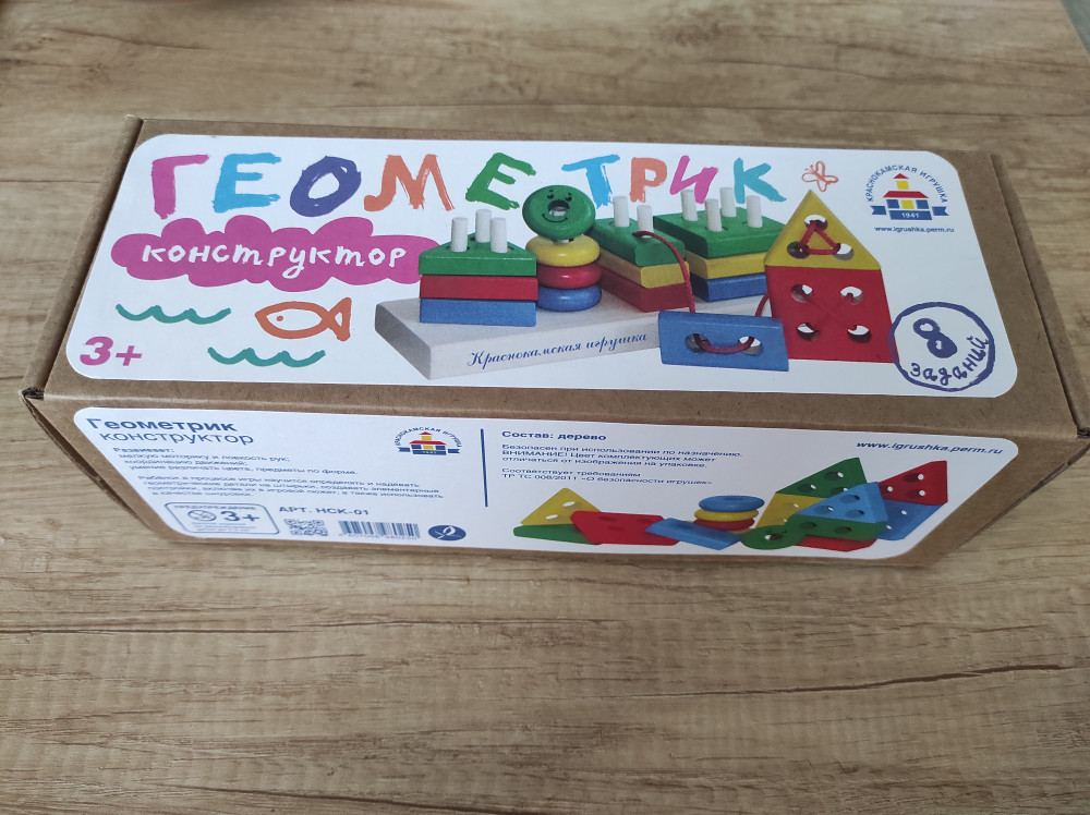Конструктор ГЕОМЕТРИК пришел. В целом, очень хорошо. Цвета яркие, фигурки аккуратные ровные по линиям своим. Но есть и замечание по запаху, запах краски, и веревка чуть маловато. Но это исправим. Веревочку заменим. А запах потихоньку проветривается.