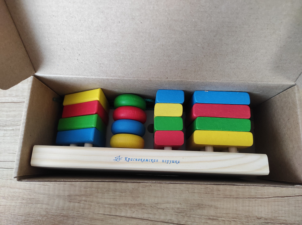Игрушка хорошего качества, пахнет деревом, детали гладкие и яркие. Ребёнок 2 лет играет с удовольствием, правда, не совсем так, как указано на картинке)) Но, главное, что дочке нравится возиться с этой игрушкой. Кроме того, учим с её помощью цвета и формы предметов.